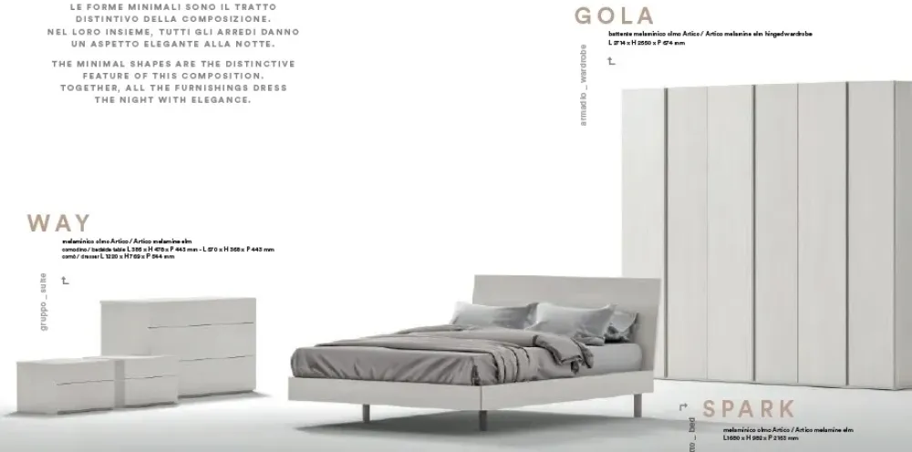 Letto SPARK giroletto sospeso, 2 comodini 1 comò WAY 1 armadio battente con 6 ante GOLA con 6 tubi appendiabiti e 3 ripiani interni sp 3 cm. Battuta parapolvere e chiusura rallentata sull’armadio in ogni singola anta. Tutti i cassetti sono dotati di guide con chiusura rallentata.