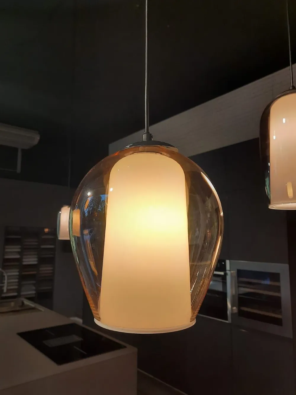 Collezione modulare basata su tre forme di vetro soffiato. Compatibile con le basi Ondaluce per soffitto ed accessori fermacavo che consentono di creare soluzioni personalizzate. Montatura metallica nera e cavi regolabili. Dimensioni: 24,5 cm + 250 cm Diametro 15 Color Ambra