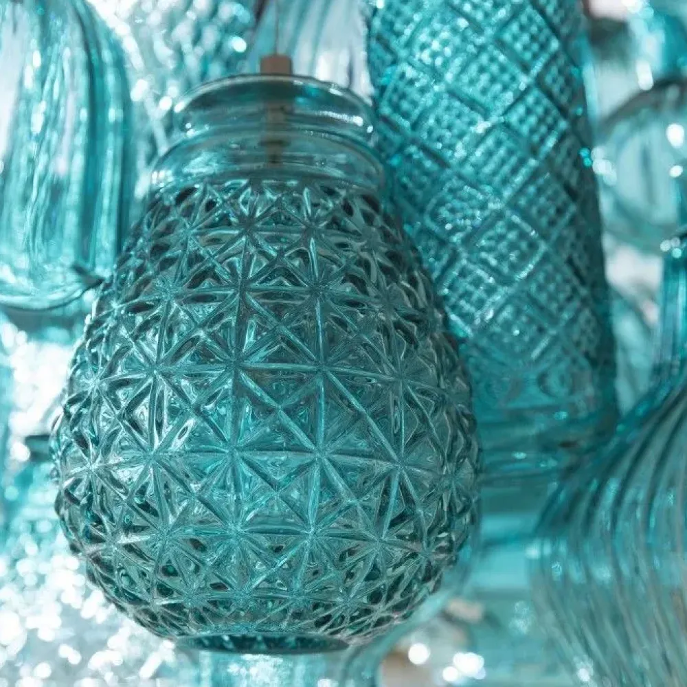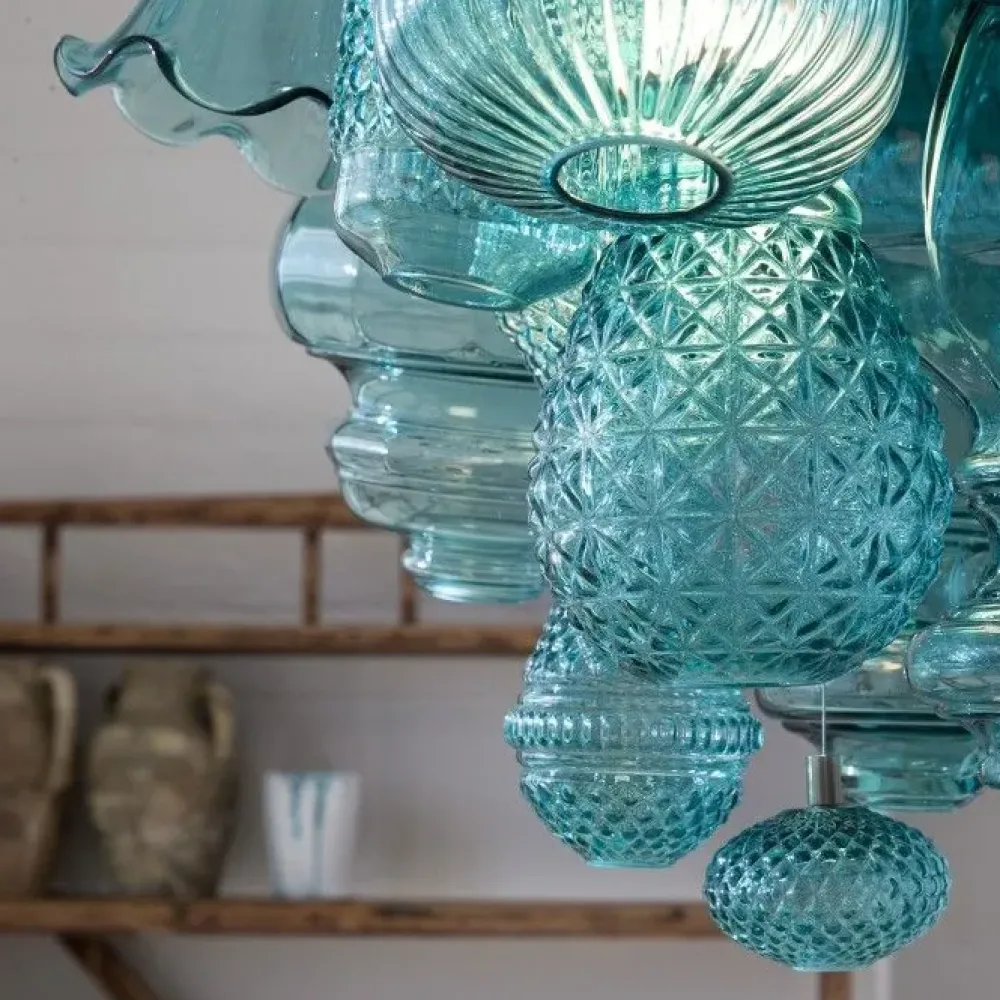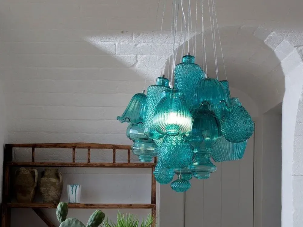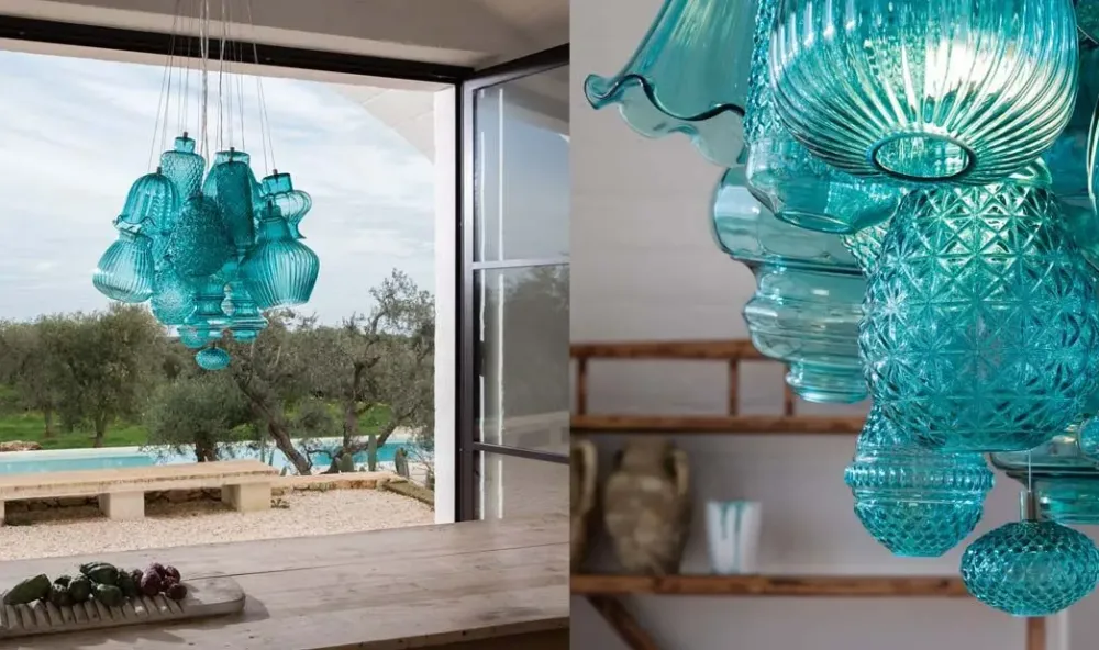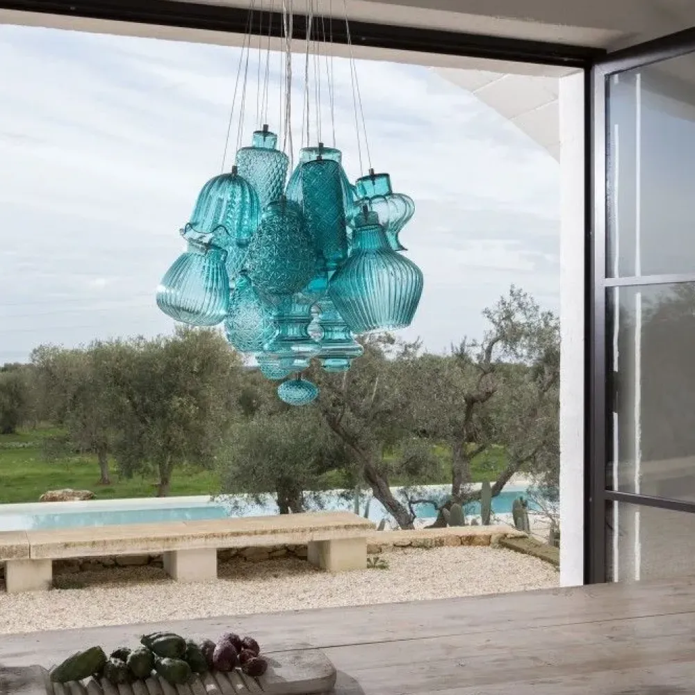 Una reunion di vetri soffiati uno a uno in forme diverse. Molteplici e variegate composizioni possibili. Nuvole informi che la luce penetra e oltrepassa. Infiniti e mutevoli effetti cromatici. La sensazione di essere proiettati oltre le pareti e trovarsi improvvisamente all’aperto sotto un cielo primaverile. A me ricorda il mare. L’acqua turchese, oltre il verde degli ulivi secolari, le pareti bianche calce, la calda pietra dorata e le terre rosse. A me ricorda il cielo.