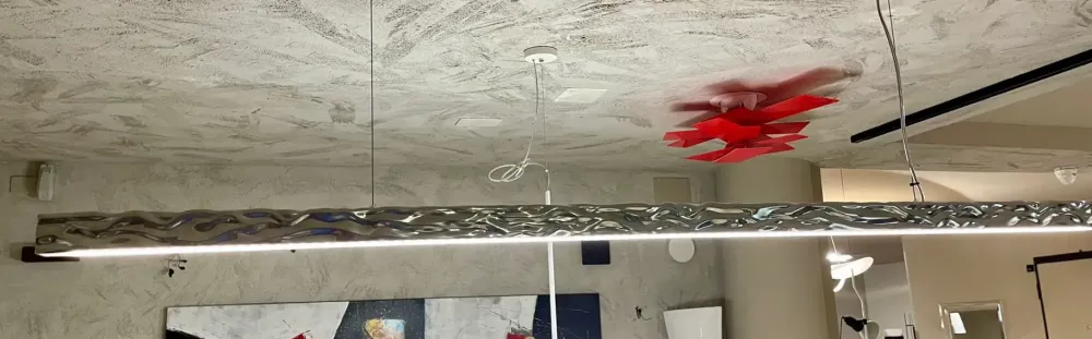 Lampada a sospensione a luce diretta. Corpo in alluminio pressofuso lucidato, diffusore in policarbonato. Cavi di sospensione in acciaio. Dimensioni L 150 x P 5 x H 5.
