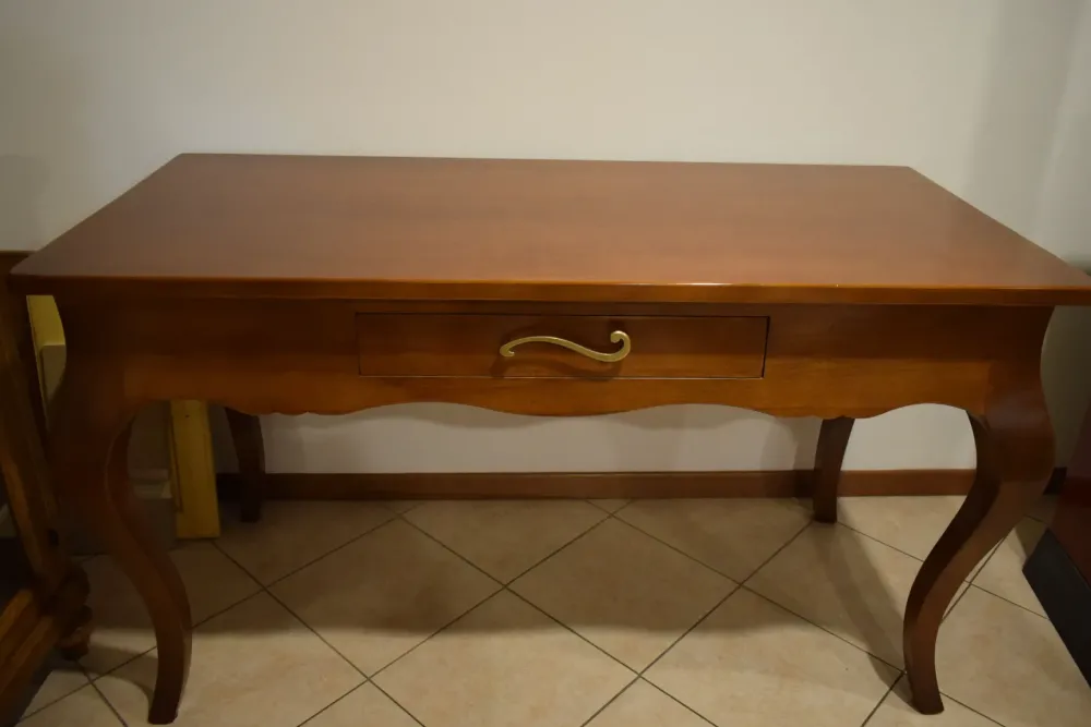 La scrivania in legno stile classico, intramontabile nel tempo, di grande arredo, un mobile artigianale costruito da sapienti falegnami veneti. Le dimensioni della scrivania è 140 x 80 con gli angoli arrotondati smussati, anche le gambe sono curve belle rotonde verso l’esterno, una forma originale, nella parte centrale un cassetto in legno, con la maniglietta in acciaio per aprirlo comodamente. La nostra offerta è di Euro 400, 00 con la consegna compresa nel prezzo, in tutta Italia. Per maggiori informazioni e dettagli inviateci info 340 0557150
