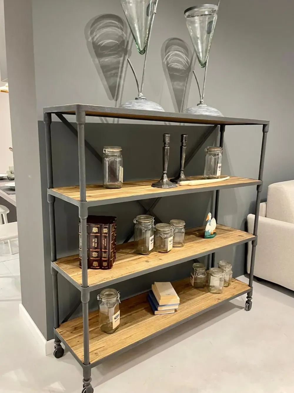 Libreria dal design industriale,facilmente posizionabile grazie alle quattro ruote.