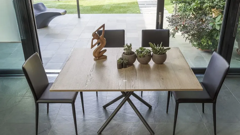 Tavolino trasformabile in tavolo da pranzo, base in metallo, meccanismo a gas.