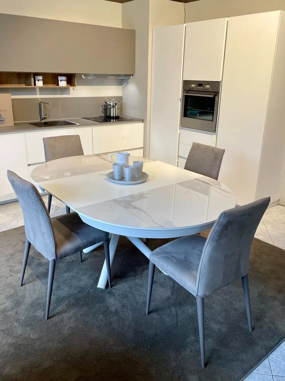 Il tavolo è proposto nella versione con basamento Bianco Goffrato M24 e piano in ceramica Bianco Statuario Venato lucido K05. La prolunga è in tinta con il piano.