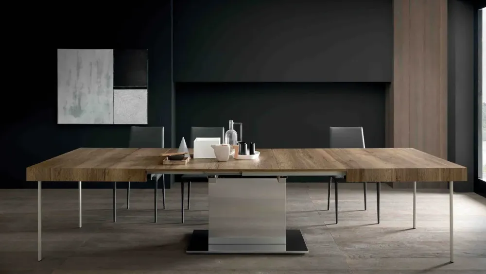 Tavolo Tower Maxi da pranzo allungabile, base centrale in metallo, piano in nobilitato, legno o effetto malta, 6 prolunghe interne. Gambe pieghevoli di supporto in (grafite verniciato goffrato) M11 per base in M04 (verniciato nero opaco) e M11 (verniciato grafite goffrato); in grisou M02 (verniciato grisou goffrato) per tutte le altre finiture.
