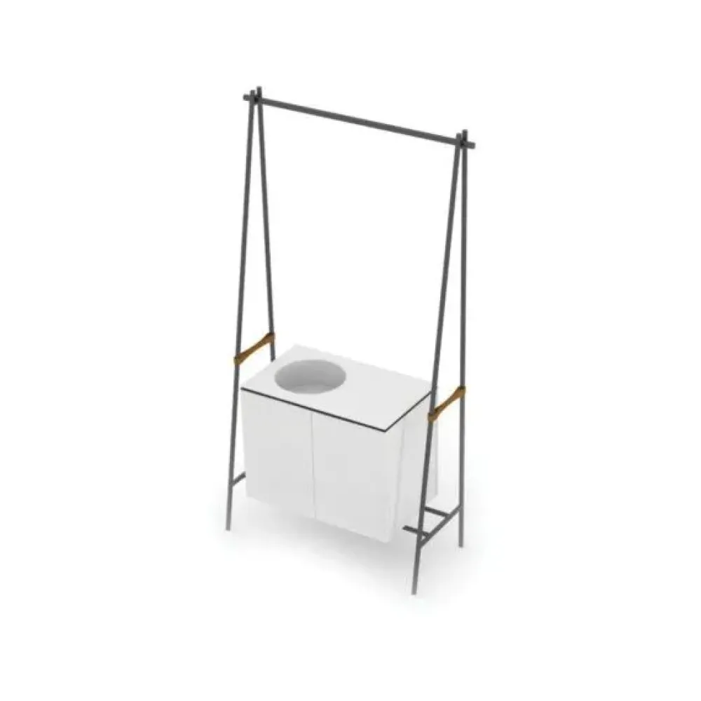 Un luogo in cui convivono grandi e piccoli: . la zona bagno Altalena 110 cm di Colavene, caratterizzata da dettagli tecnici innovativi e soluzioni compositive originali.Altalena è una composizione che appartiene alla visione di un bagno destrutturato, fatto di elementi utili e non convenzionali. Altalena si caratterizza per il suo stile essenziale e neutrale, adatto per un ambiente giovani e informale. Altalena 110 cm è una struttura in acciaio nero Matt con verniciatura a polvere.Altalena 110 si compone di un mobile (80 x 48 x 62) con finitura rovere naturale, un’asta illuminante beige, un lavabo Skyland 80 x 48 cm in ceramica Bianco Matt con vasca a sinistra e foro rubinetteria, uno specchio rotondo con profilo in inox nero Matt e cuoio (60 cm diametro), un portasciugamani in inox nero matt e cuoio, piletta e sifone nero Matt.Sono disponibili altre finiture per il mobile e per la ceramica su richiesta in negozio. Dimensioni: Larghezza: 110 cm Altezza: 220 cm Profondità: 48 cm Colavene Dal 1968 Colavene, grazie alle sue intuizioni e all’instancabile lavoro, produce i mobili per sottolavello e per lavanderia che hanno conquistato rapidamente il mercato idrosanitario e il buon gusto per l’arredo della casa.