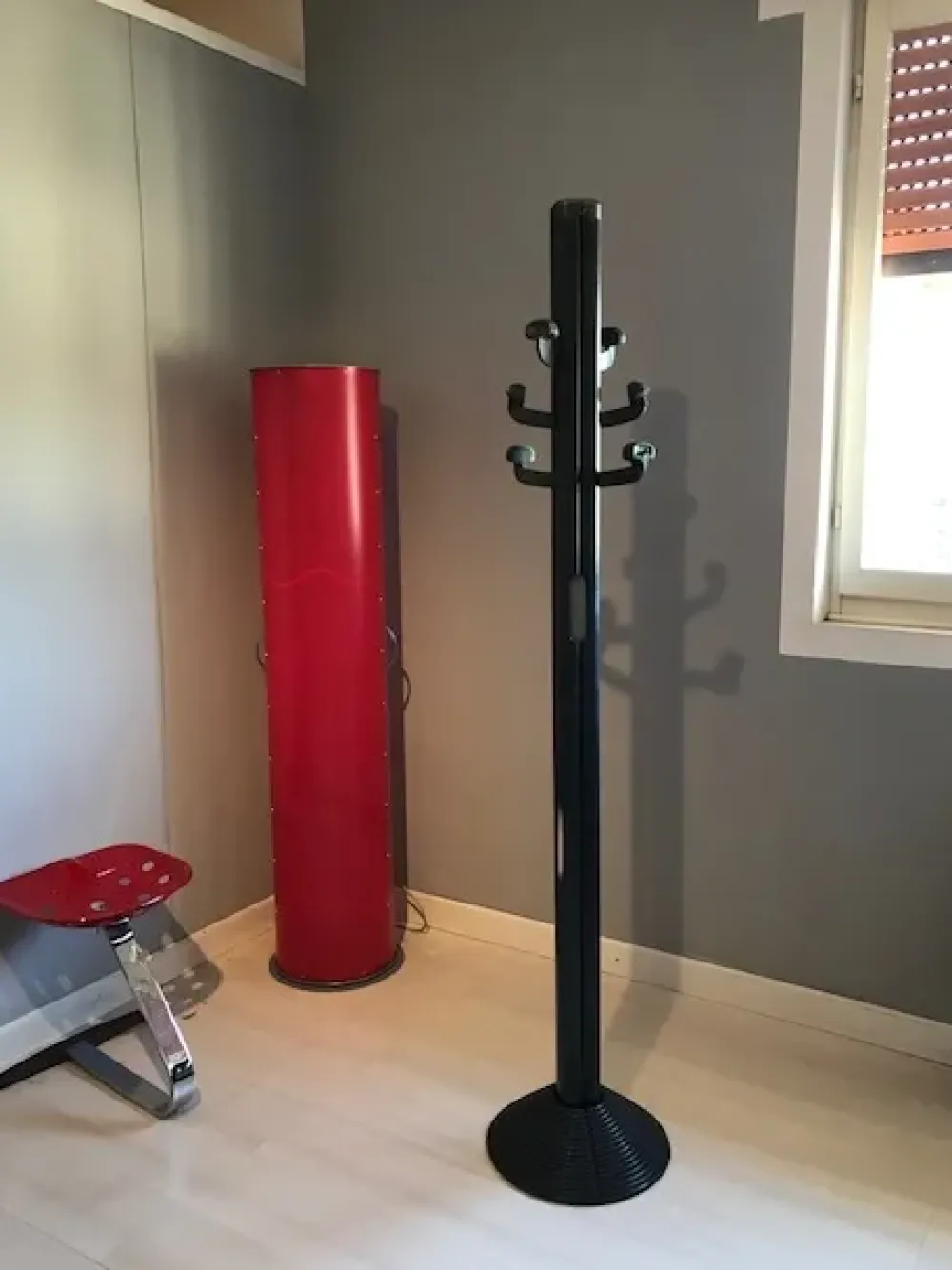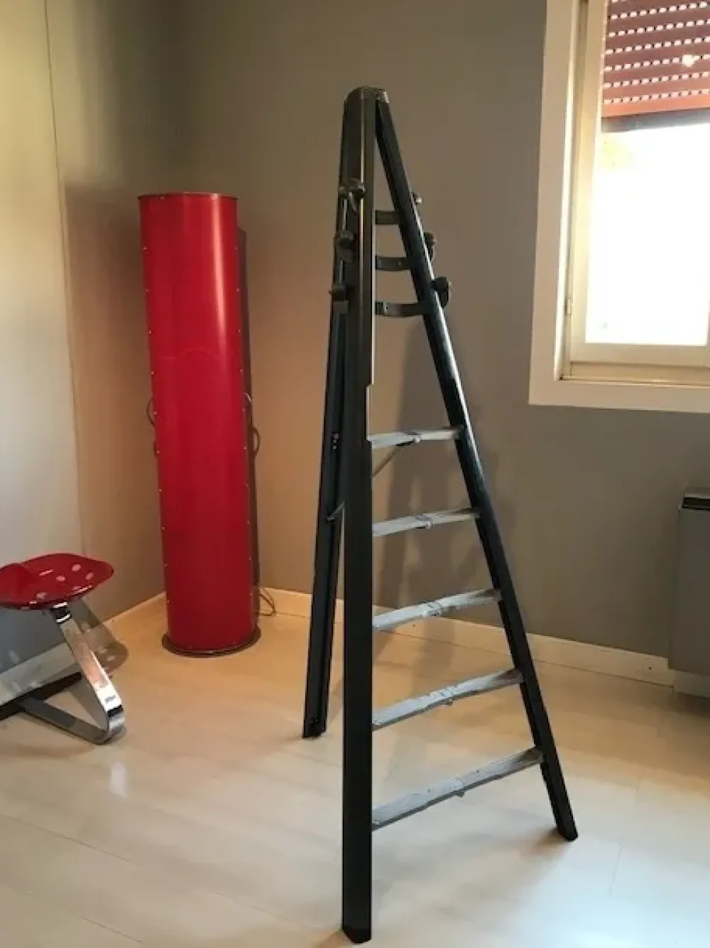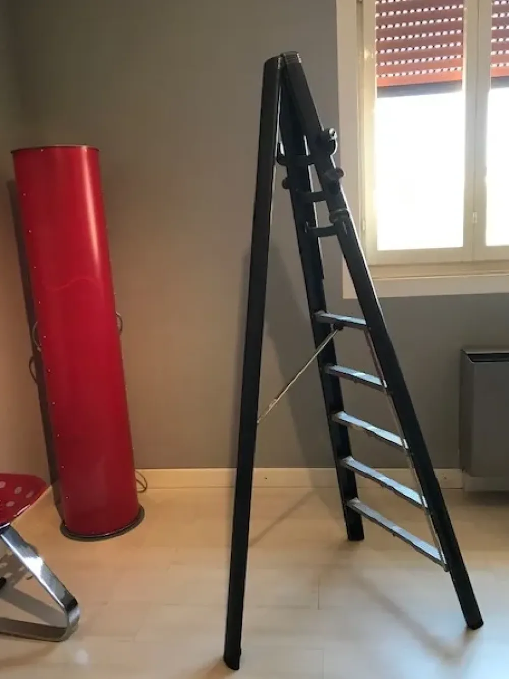 Appendiabiti-scala. Fuoriuscendo dalla sua base si trasforma in una scala a compasso con tre montanti – dotata di solidi gradini in alluminio pressofuso – che all’occorrenza e una volta riposizionata nella propria base, ritorna ad essere appendiabiti. Dimensioni cm. Ø40xh196