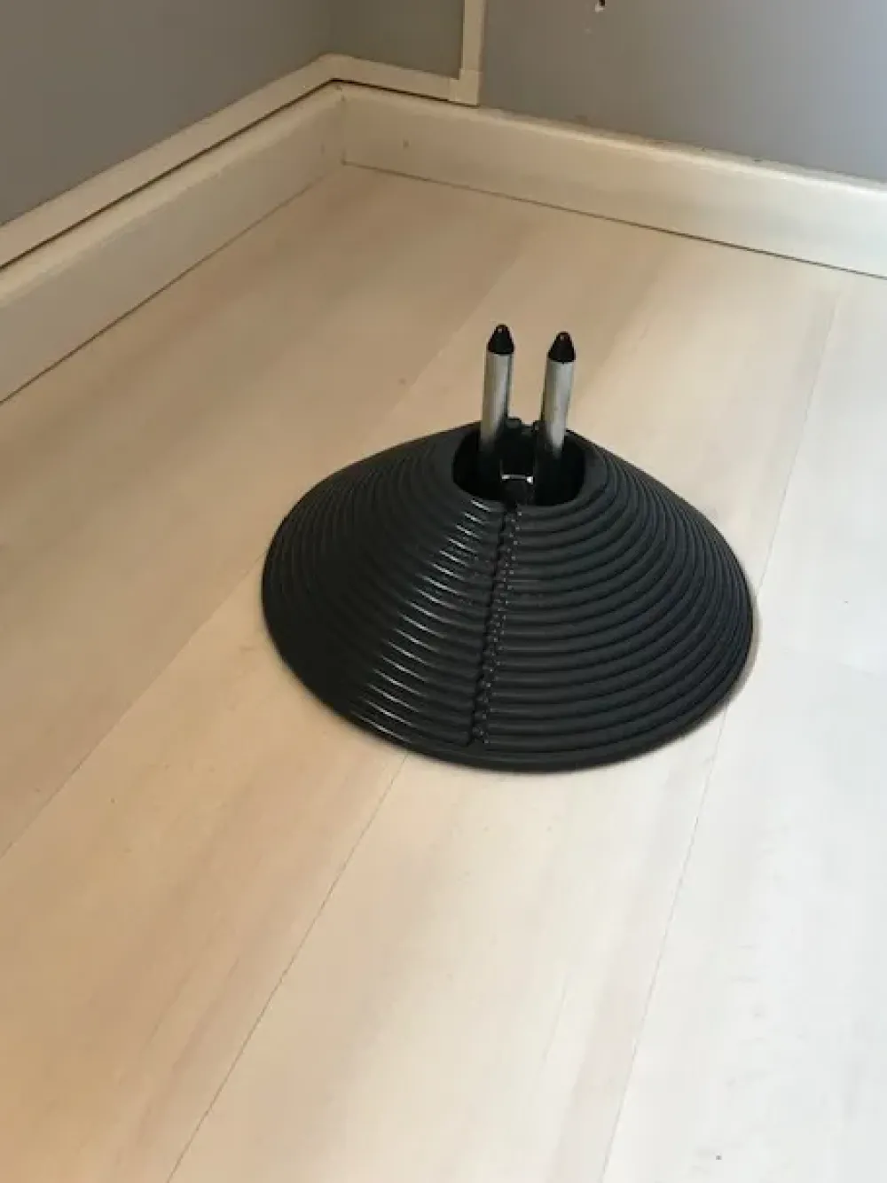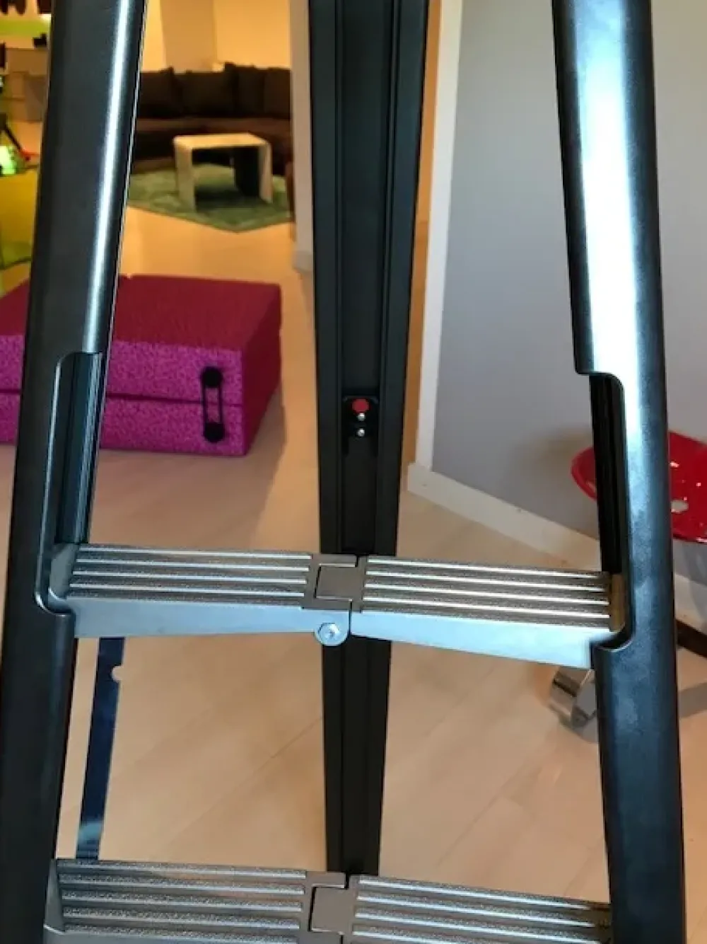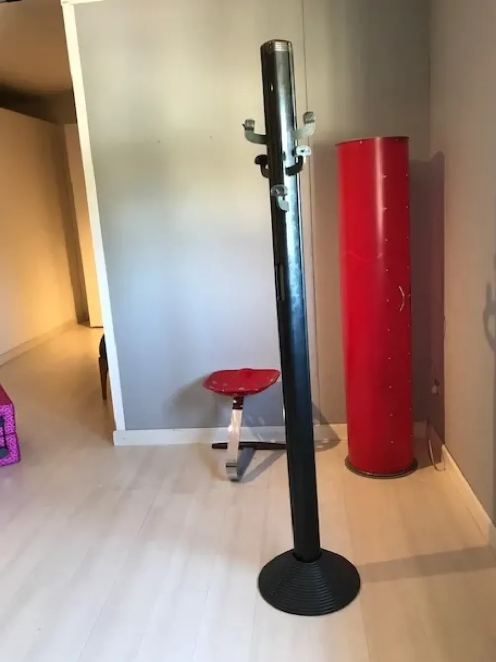 Appendiabiti-scala. Fuoriuscendo dalla sua base si trasforma in una scala a compasso con tre montanti – dotata di solidi gradini in alluminio pressofuso – che all’occorrenza e una volta riposizionata nella propria base, ritorna ad essere appendiabiti. Dimensioni cm. Ø40xh196