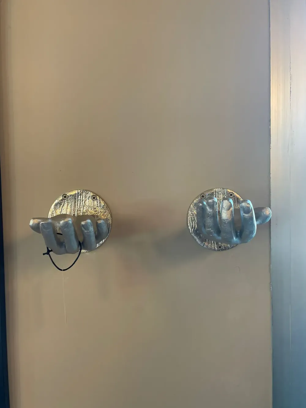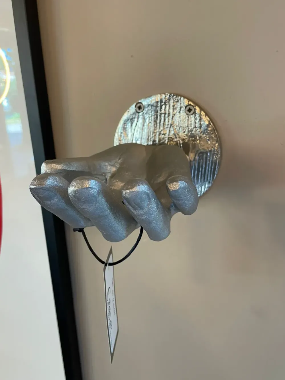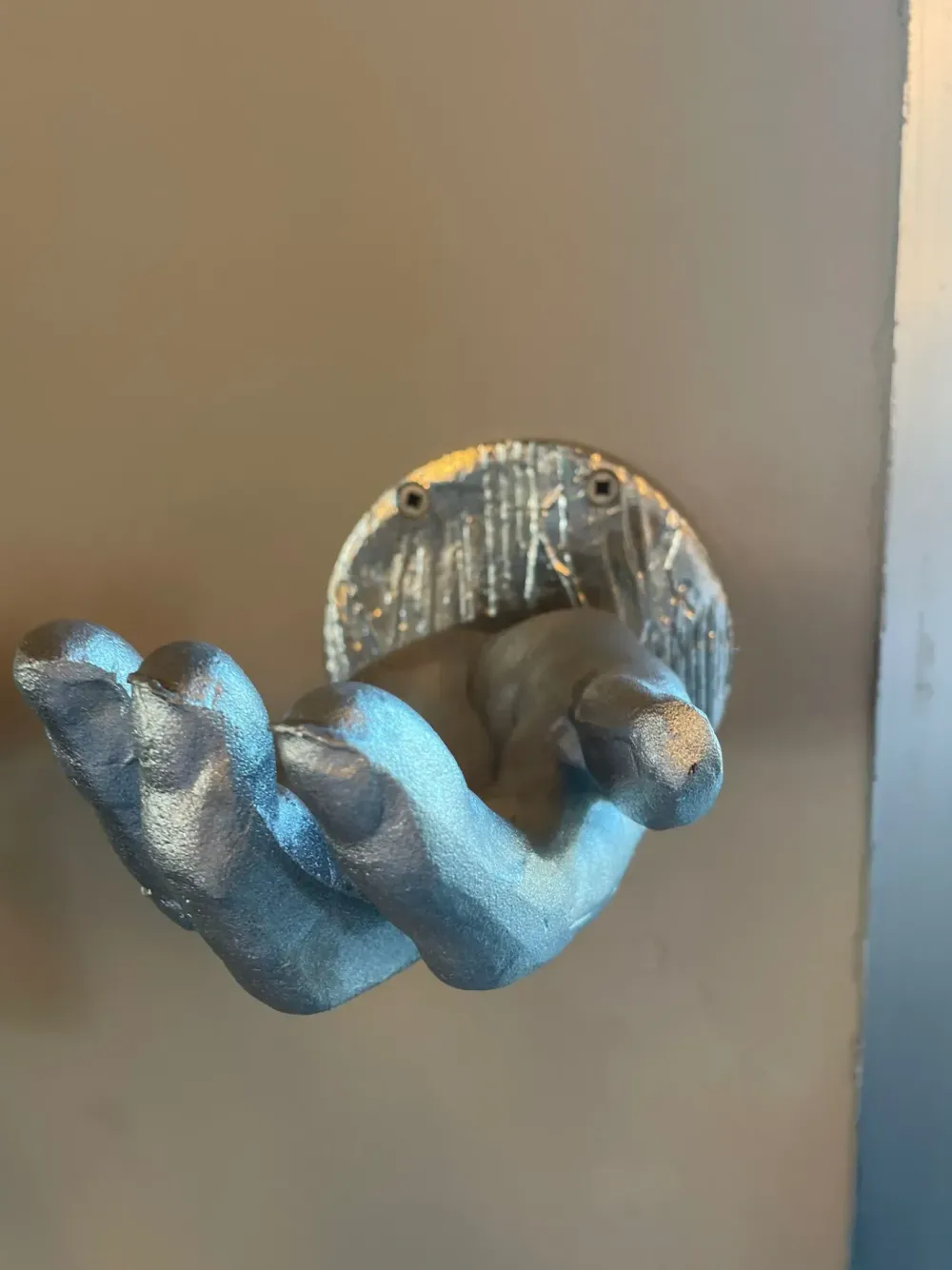 Coppia di mani in fusione di alluminio con guanti da lavoro in dotazione.
