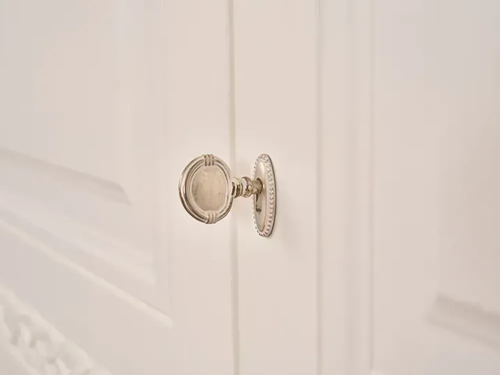 Armadio Benedetti Mobili mod. Cedro con Portale 4 ante battenti con chiave argento sbiancato – struttura interamente in tamburato di legno interni impiallacciati in Noce Tanganica – finitura esterna Smalto pennellato bianco senza sopracolore – attrezzatura interna: Cassettiera interna 3 cassetti cm L 141,3 x h 61,6; nr. 2 ripiano interno sp. 4 cm; nr 3 tubo appendiabiti L 141,3 cm