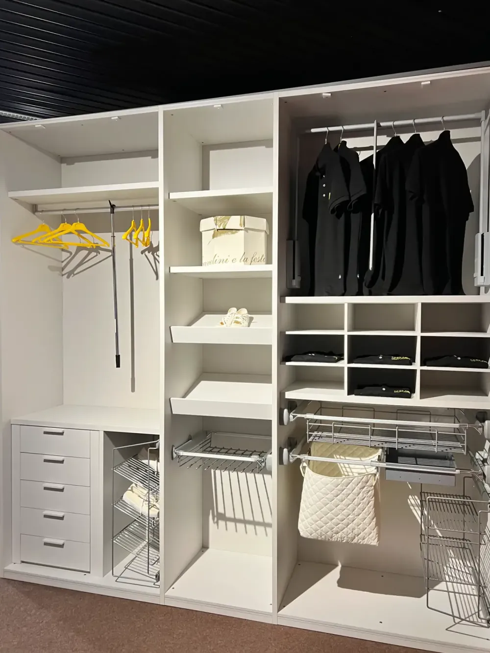 Completa di attrezzatura interna con cassettiera a 5 cassetti, porta pantaloni, ripiani, raster porta camicie, porta scarpe, cesti estraibili, tubi appendiabiti, servetto estraibile ed illuminazione a led. Gli spazi sono stati studiati in modo da poter riporre più comodamente ogni genere di indumento.