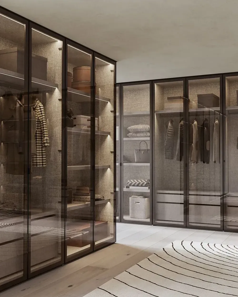 Il programma Casio disponibile in varie finiture di struttura, mentre le ante in vetro o specchi con telaio in metallo nero, titanio, o laccato opaco.