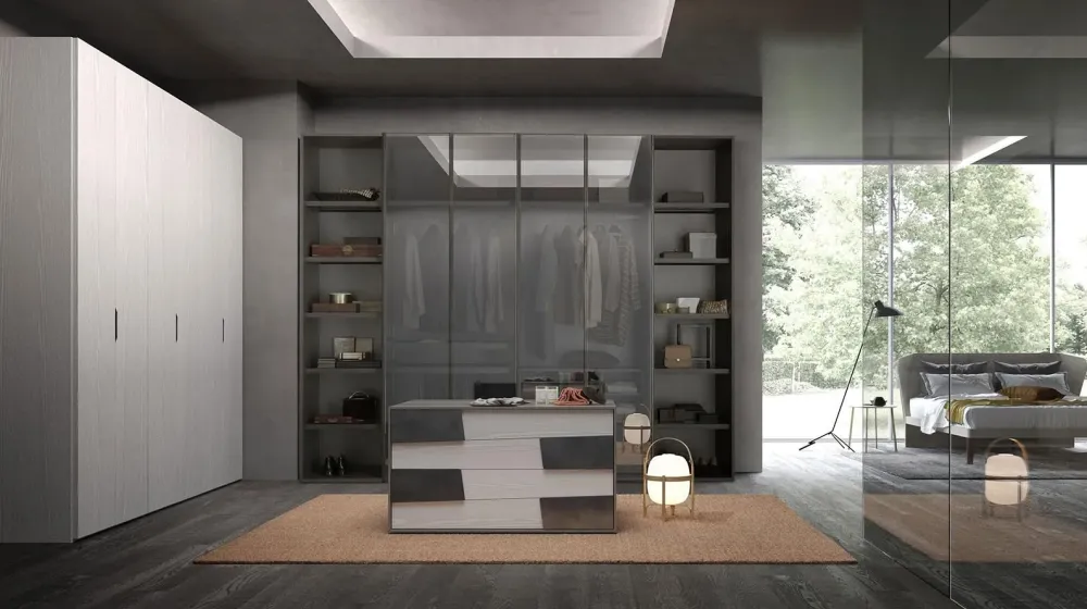 Armadio a 4 ante in vetro con 2 elementi a giorno laterali finitura interna in nobilitato tessuto Grey , anta Vitra vetro riflettente e ripiani legno vani laterali.