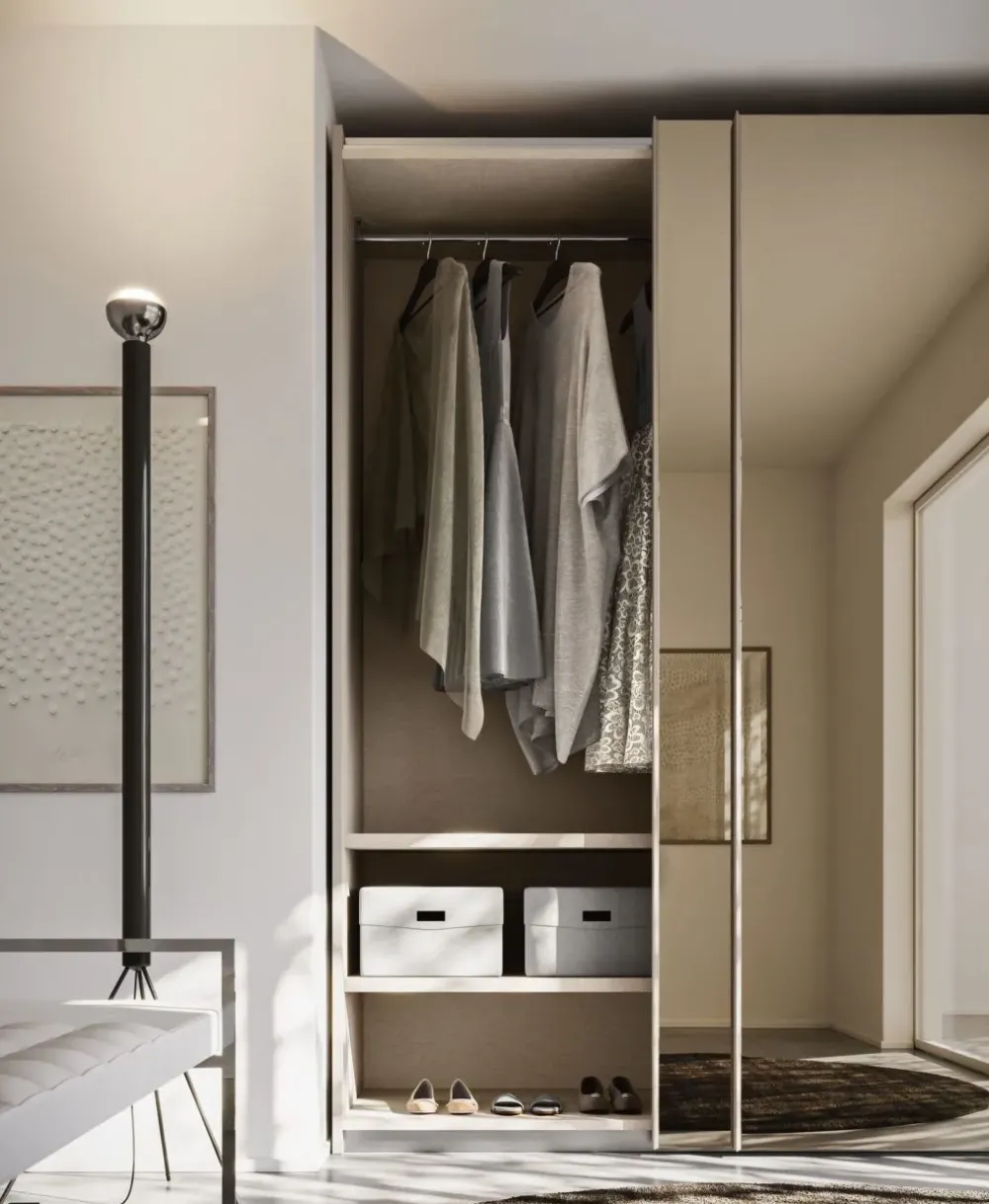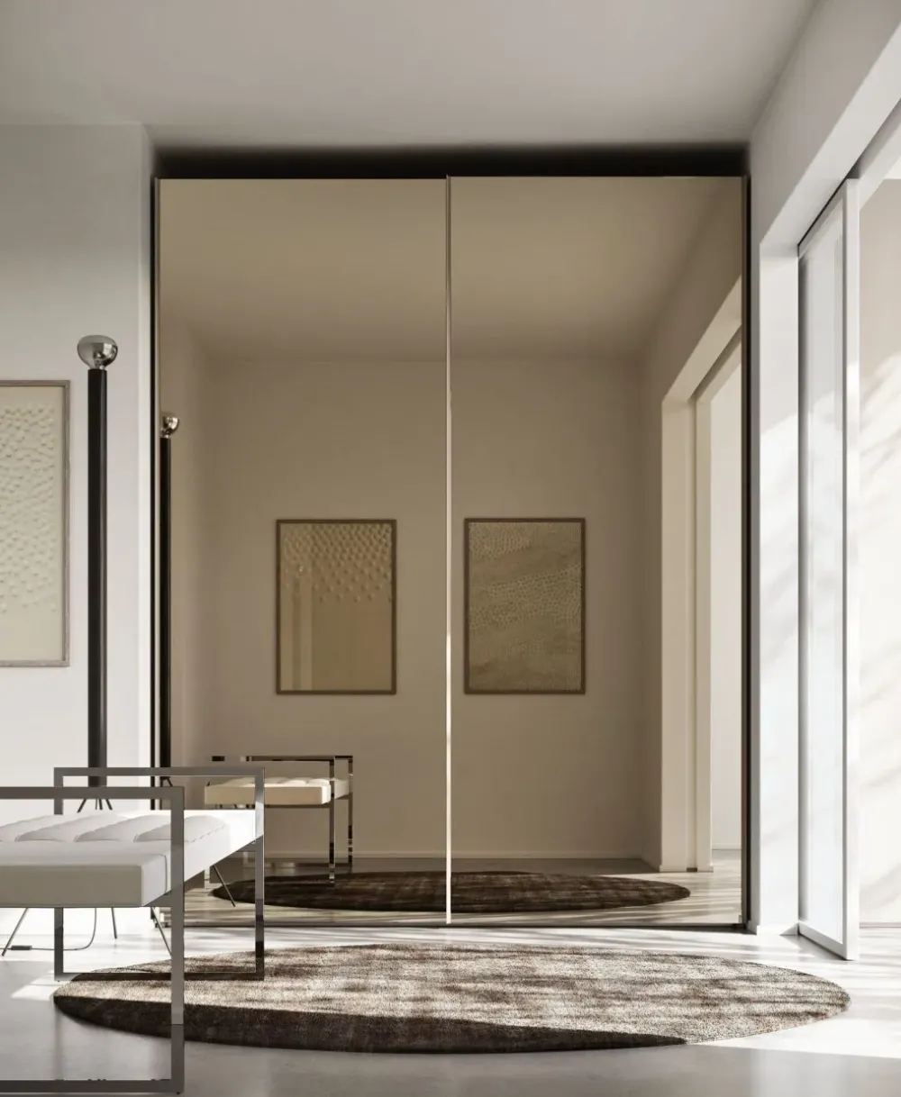 ARMADIO 2 ANTE SCORREVOLI Armadio scorrevole con anta Specchio e profili Tortora. FINITURE Melaminico Tortora, specchio Bronzato, interno Cotone DIMENSIONI L 2025, H 2578, P / D 680 mm E INSTALLAZIONE .200 5