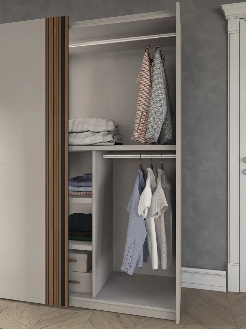 - **Specchi interni:** Se vuoi comprare sistemi con specchi da accostare a questo armadio, dovrai richiederli direttamente a noi e potrai ottenerli con un supplemento, dato che questa proposta non include nessuno specchio.