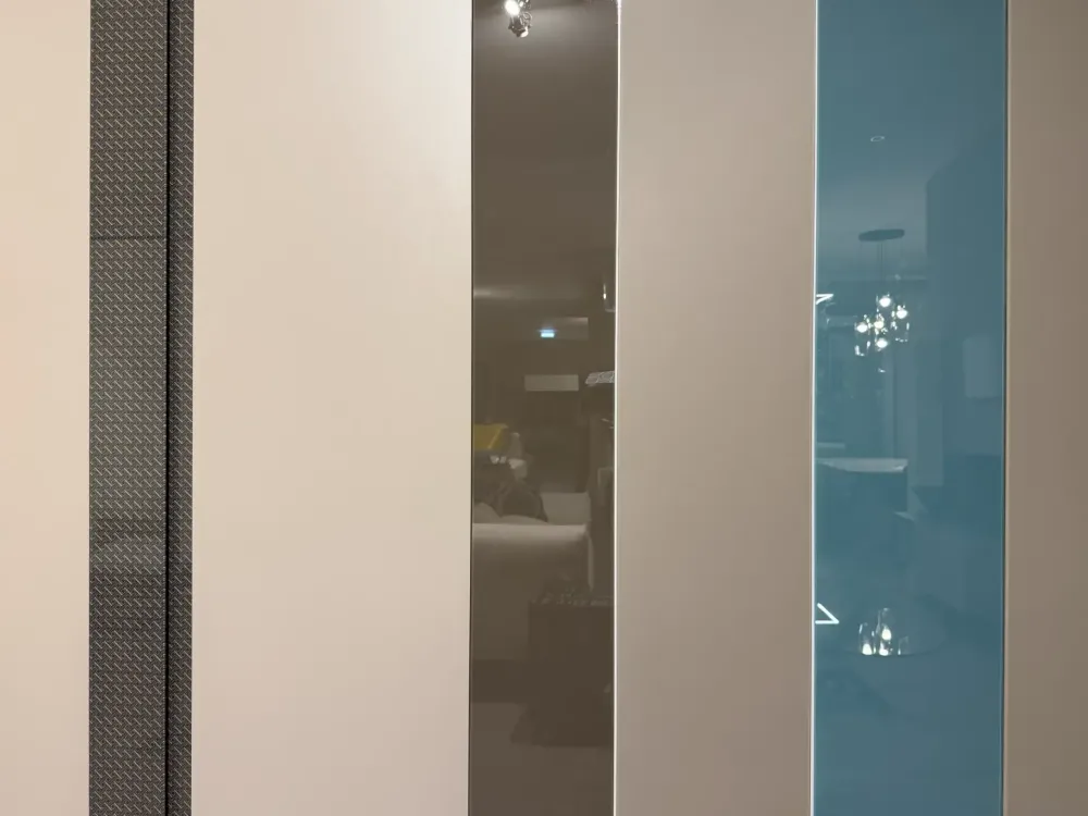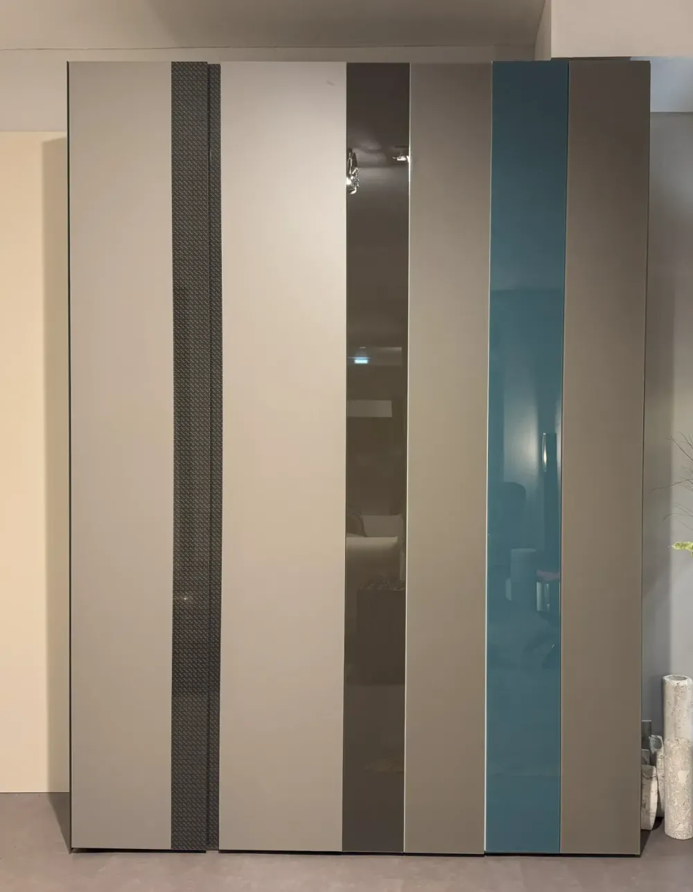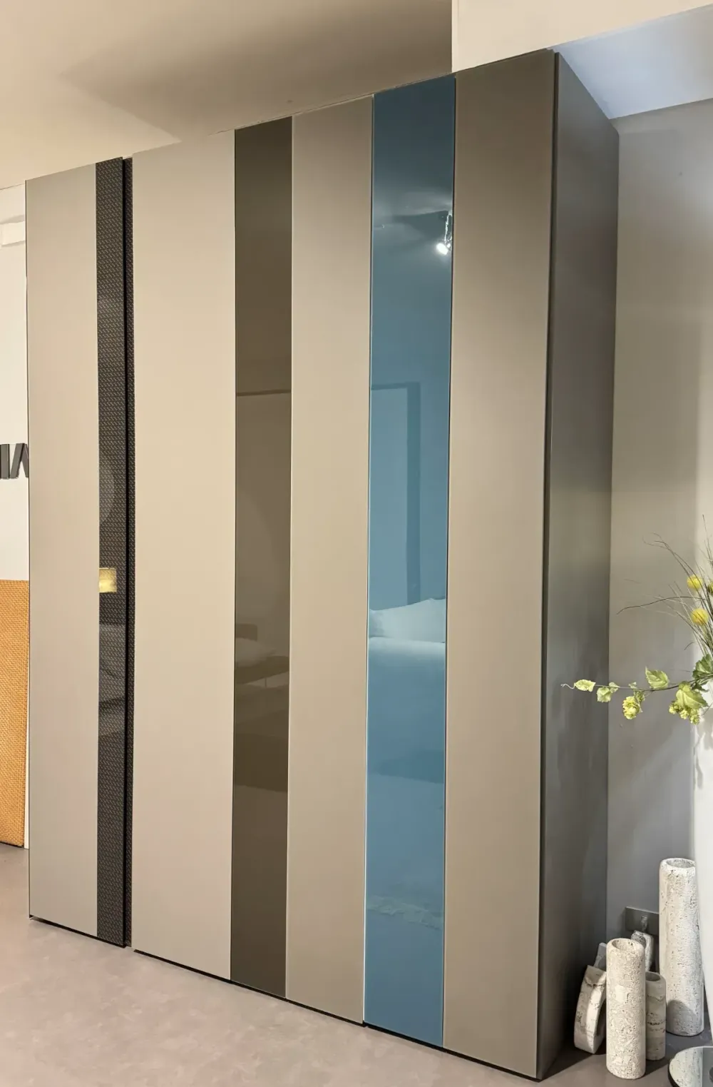 Il fianco finito con vetro lucido asimmetrico enfatizza il carattere dinamico dell’armadio, rendendolo un elemento distintivo in qualsiasi ambiente.
