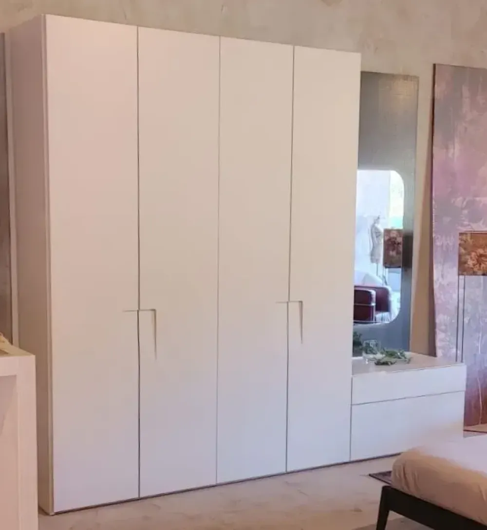 Armadio ad ante battenti mod Niban laccato opaco colore Piuma con maniglia inserita nell’anta. Interno rovere con led inseriti nei fianchi. Cassettiera esterna completa di boiserie e specchio retroilluminato. Lunghezza totale L 300