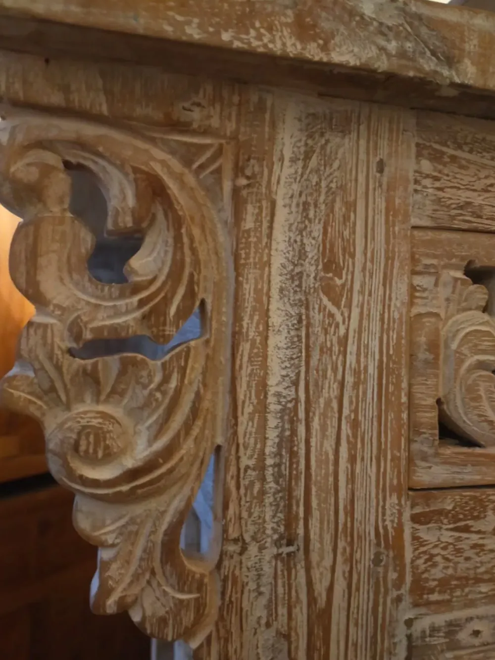 Consolle Bagno Teak Decapata 120, Consolle etnica orientale – prodotto artigianale in legno di Teak massello riciclato, con finitura sbiancata. Linea elegante e intagliata finemente con motivi floreali! Perfetta come consolle arredo bagno con lavello in appoggio, trova spazio anche in ingresso o nella zona notte! Composta da 2 cassetti. Possibilità di avere anche il lavandino in pietra o marmo. Richiedi un preventivo completo.