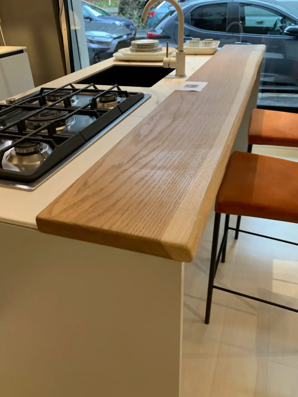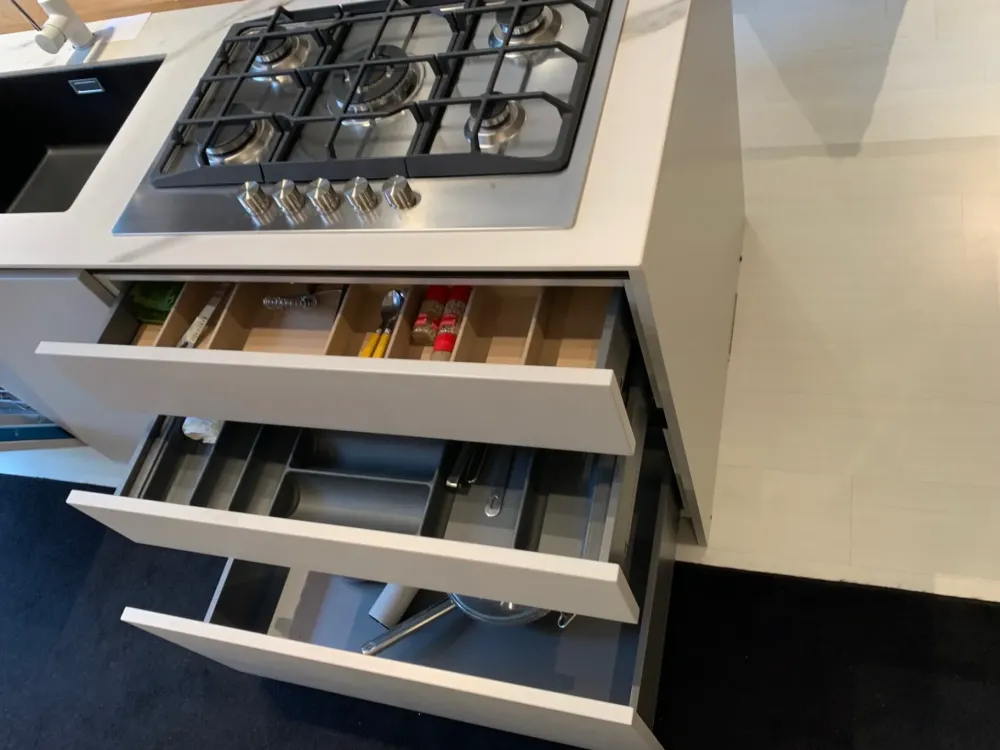 - In questa proposta è irrinunciabile un top cucina di tutto rispetto: è incluso nel prezzo Outlet un piano operativo in gres, perfetto per unire doti di praticità e design, mantenendosi nel tempo anche dal punto di vista dell’estetica.