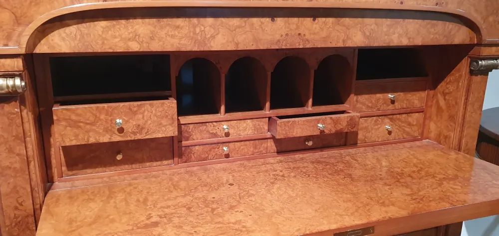 Scenografico gruppo in noce e radica in stile direttorio con accenni neoclassici. Le dimensioni del cassettone sono L. 113 x p. 52/72 aperto x h. 118 cm mentre i comodini misurano L. 53 x p. 34 x h. 70 cm. Tutti i pezzi sono realizzati in noce e rifiniti in radica di frassino. Il cassettone è composto da tre generosi cassetti ma la sua caratteristica principale è la parte apribile a ribalta che svela un bellissimo interno composto da otto cassetti e quattro vani; al di sopra si trova annegato nella sagoma un cassetto a tutta larghezza. Lo stesso motivo si ritrova nei comodini che così sommano ai tre cassetti con maniglia un ulteriore vano utilizzabile. Tutti e tre i pezzi sono impreziositi da maniglie e stilemi in ottone lucido. Come per tutti i nostri mobili, l’imballo è omaggio ed il trasporto escluso, se richiesto, ci appoggiamo e lo preventiviamo solo con corrieri a noi abituali e specializzati in trasporto mobili.