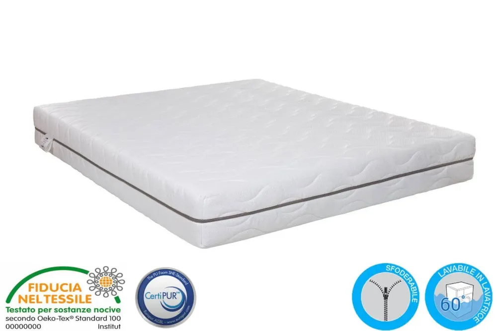 Materasso memory foam di materiale che nasce da una miscela di materie eco-compatibili e acqua: Materasso anallergico con un supporto rigido e un soffice memory traspirante Adatto a tutti, è molto confortevole anche per chi soffre di scarsa circolazione e dolori lombari, con un rapporto eccezionale di qualità/prezzo Anallergico e traspirante ad alta densità si adatta alla forma del corpo dando una sensazione sotto semirigida e la parte superiore soffice, mantiene corretta la posizione della colonna vertebrale. Viene fornito con rivestimento di serie in Silver anallergico. Altri rivestimenti sono possibili su richiesta; sfoderabile su 4 lati e lavabile in lavatrice fino a 60 gradi.