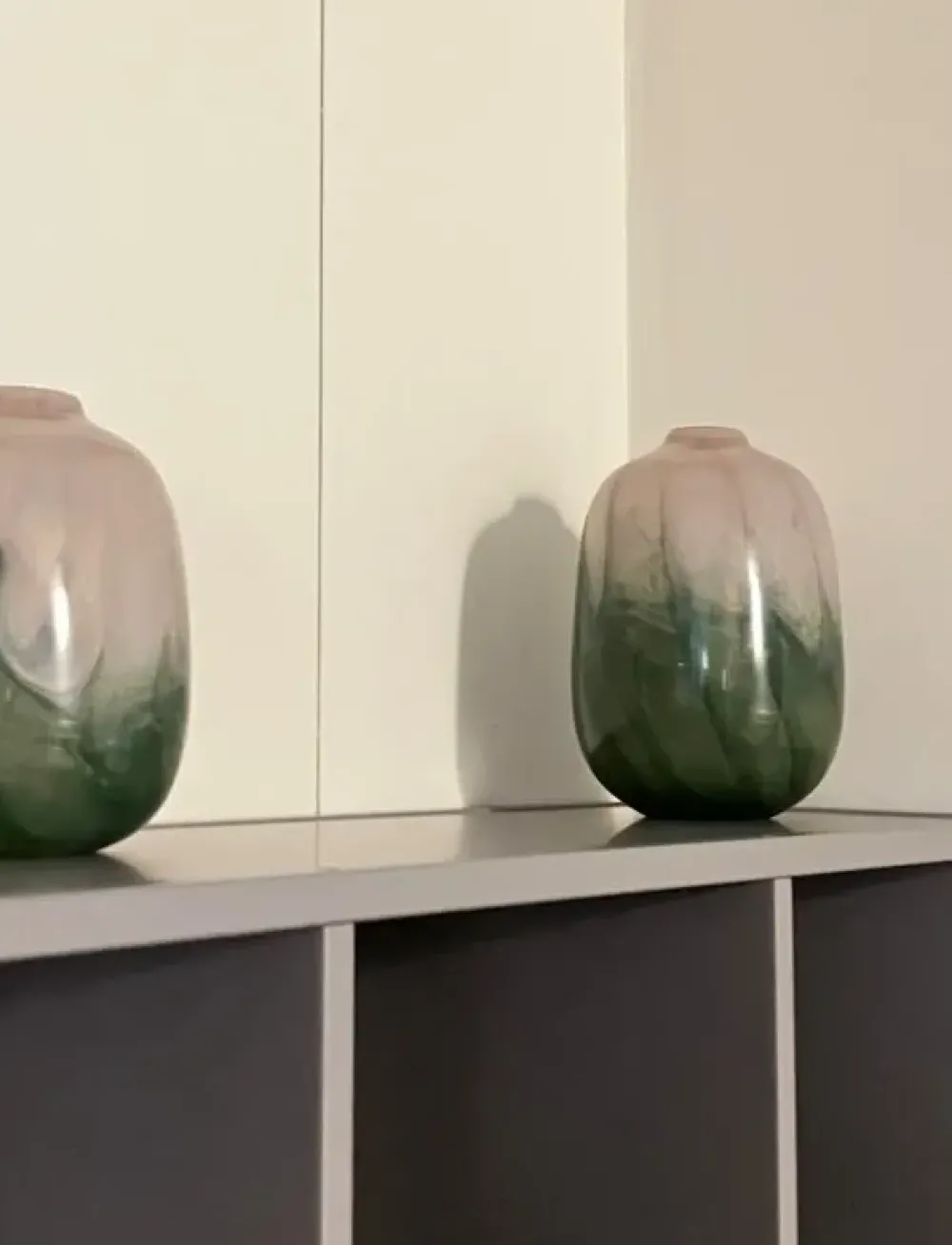 Vaso di vetro grande di colori rosa e verde, con una sfumatura orizzontale dei colori