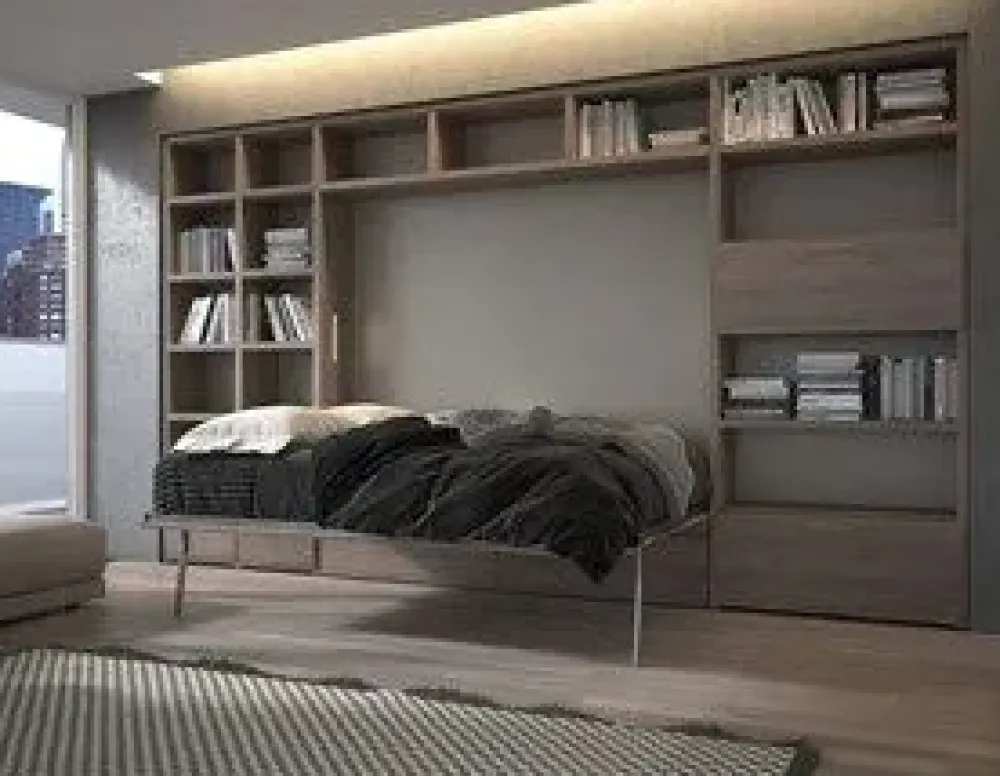 Mobile componibile soggiorno di ” LINEA IN ARREDAMENTI “,affascinante e funzionale nello stesso tempo che consente di poter disporre con dei semplici movimenti di letti matrimoniali, singoli,francesi,castello singolo e doppio,divani e librerie riducendo al minimo l’ingombro quando sono chiusi e assicurando la massima comodità durante la notte. Sistema trasformabile con letto matrimoniale,apertura manuale abbattibile orizzontalmente,pronto all’uso. E’ possibile acquistare separatamente i vari pezzi della composizione secondo le varie esigenze. E’ possibile aggiungere alla composizione: – armadi,tavoli estraibili,divani,poltrone,pouff,sedie, ecc. – luci di lettura interno letto a incasso con accensione indipendente. – testata per letto imbottita e rivestita in tessuto vs.scelta. – scegliere colori di finitura diversi E’ possibile modificare la composizione con: – letto singolo L. cm 85,letto 1 piazza e mezza L. cm 110,letto francese L. cm 140 – apertura e chiusura letto elettrica con telecomando Wireless – realizzazione anche “su misura” per librerie, armadi, mensole, scrivanie Scheda informativa del prodotto – nobilitato melaminico Classe E 1 – schienali letto e librerie,finitura: Grigio – struttura,ripiani librerie,cassettoni, 1 pannello letto chiuso,finitura:Rovere naturale – pannello inferiore letto chiuso, finitura:Sabbia – maniglie inox satinato La composizione comprende: – modulo a ponte con librerie a giorno,cassettoni e pensile orizzontale con anta L. cm 412 x P. 34 x H.236,8 – letto trasformabile matrimoniale apertura ORIZZONTALE chiuso L. cm 212 x P.33 (aperto Lunghezza cm 183 x Larghezza 170) completo di: rete ortopedica apertura in Orizzontale con struttura in metallo verniciato a fuoco e pianale con doghe in legno faggio con apertura/chiusura manuale – fasce elastiche ferma materasso regolabili con velcro – portata massima KG 200 – misure materasso: L. cm 160 x P. 195 x H. 18 (escluso) – è obbligatorio l’ancoraggio del mobile a parete – (è assolutamente vietato il montaggio su pareti in cartongesso) – misura composizione L. 412 x P.33/183 x H.236,8
