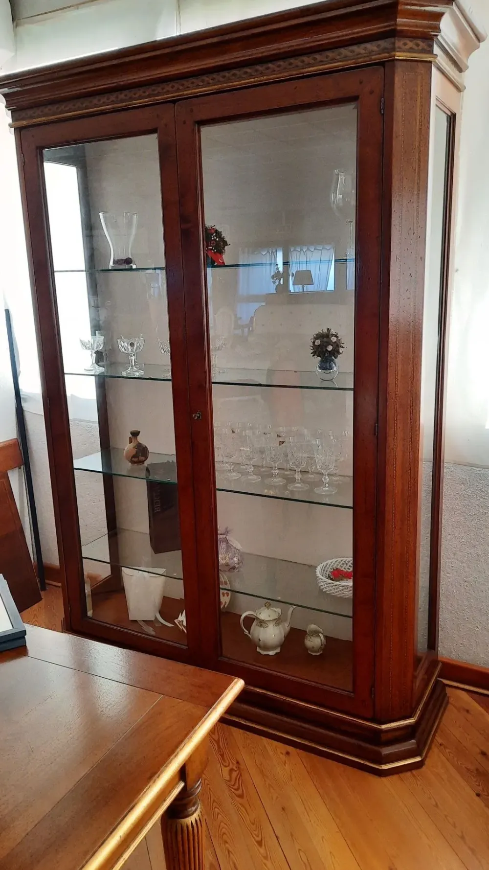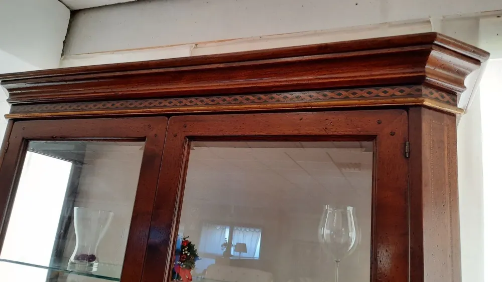 Vetrina completamente massiccia in legno di Noce, con ante a vetro e intarsi 160x50x210 h Vetrina artigianale massiccia con finitura Noce Antiquariato e Foglia Oro, DISPONIBILE IN TUTTI I COLORI DEL NOSTRO CAMPIONARIO . Rimaniamo a disposizione per qualsiasi informazione o tramite il form o chiamando i nostri uffici
