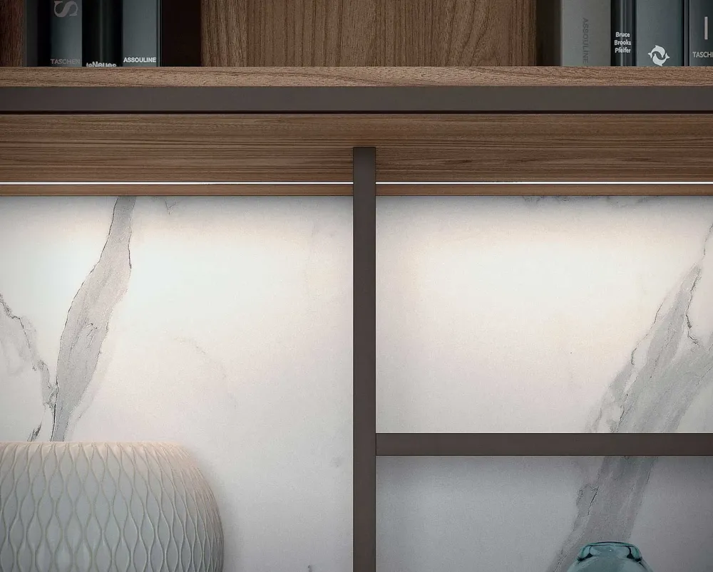 - Maniglia senza maniglia: Il modello Mood 14 è dotato di una maniglia senza maniglia, che conferisce un aspetto minimalista e pulito alla parete attrezzata.
