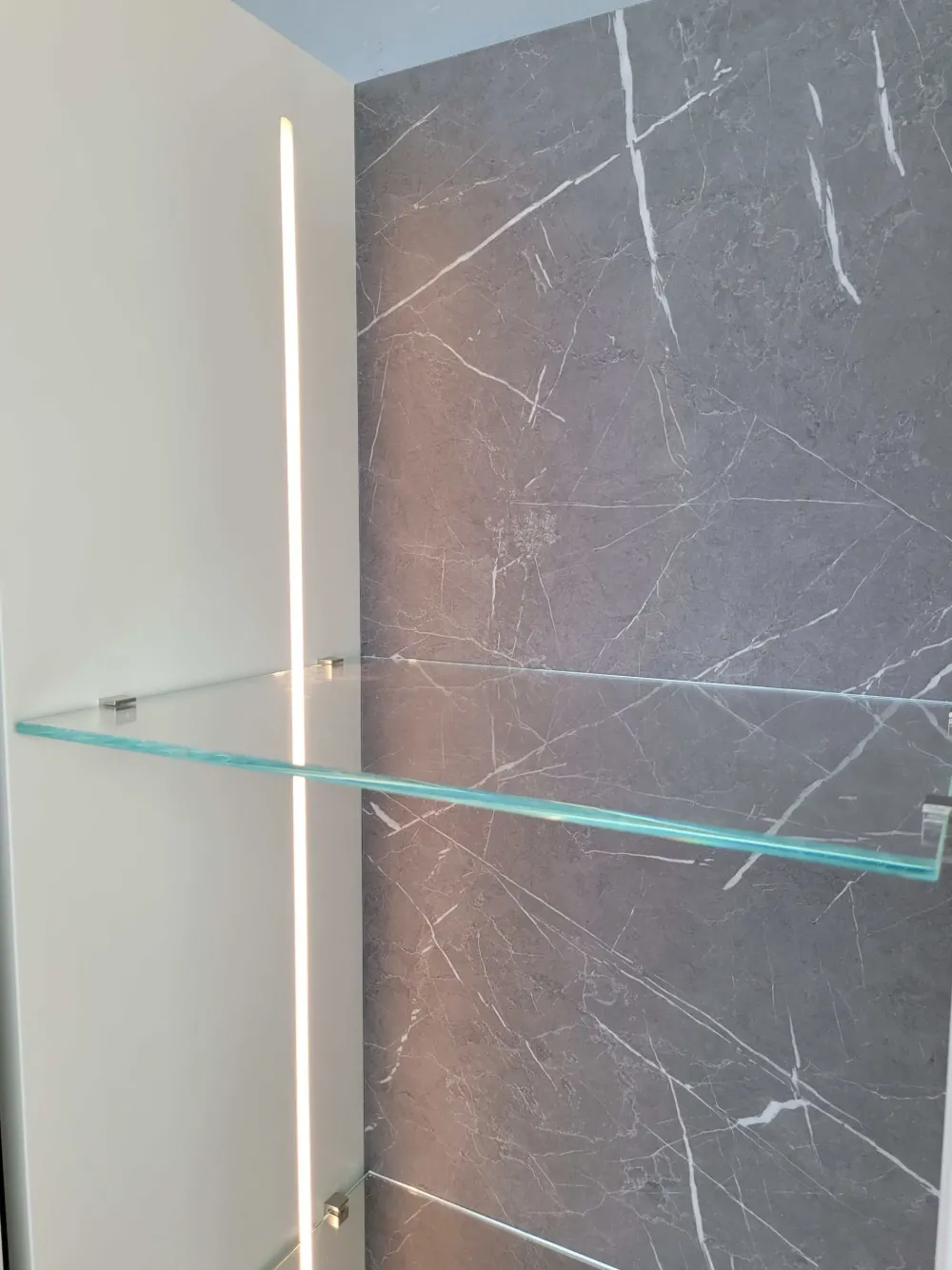 Sono presenti tre elementi a terra con anta a battente e ripiani interni in vetro trasparente, molto comodi per riporre l’occorrente per la tavola o qualsiasi altro oggetto. Sono in laccato opaco colore CAPPUCCINO, colore che si sposa alla perfezione con la finitura essenza Olmo Autunno dei due cassetti sospesi presenti in basso. Ulteriore valore aggiunto alla composizione la danno le barre a LED incassate sui fianchi degli elementi con anta che illuminano lo schienale in HPL finitura marmo grigio.