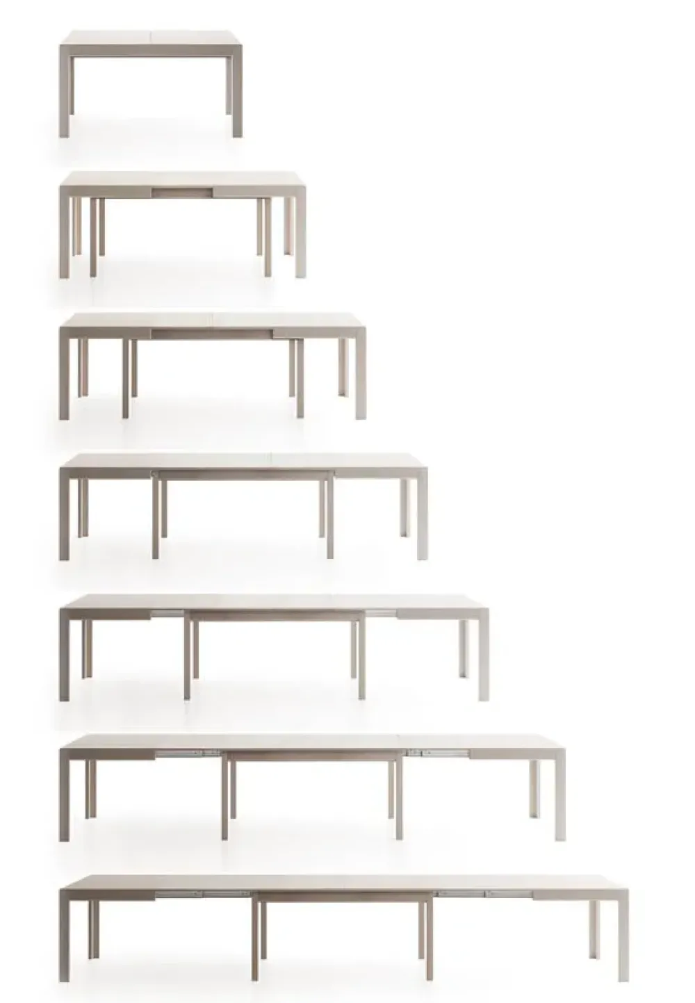 Convivio è un tavolo rettangolare allungabile con guide in alluminio e gambe sdoppiabili. Convivio in promozione è in versione da 120×95, allungabile con 4 allunghe interne e 2 allunghe esterne da 50 cm in finitura laccato bianco poro aperto cod.302.
