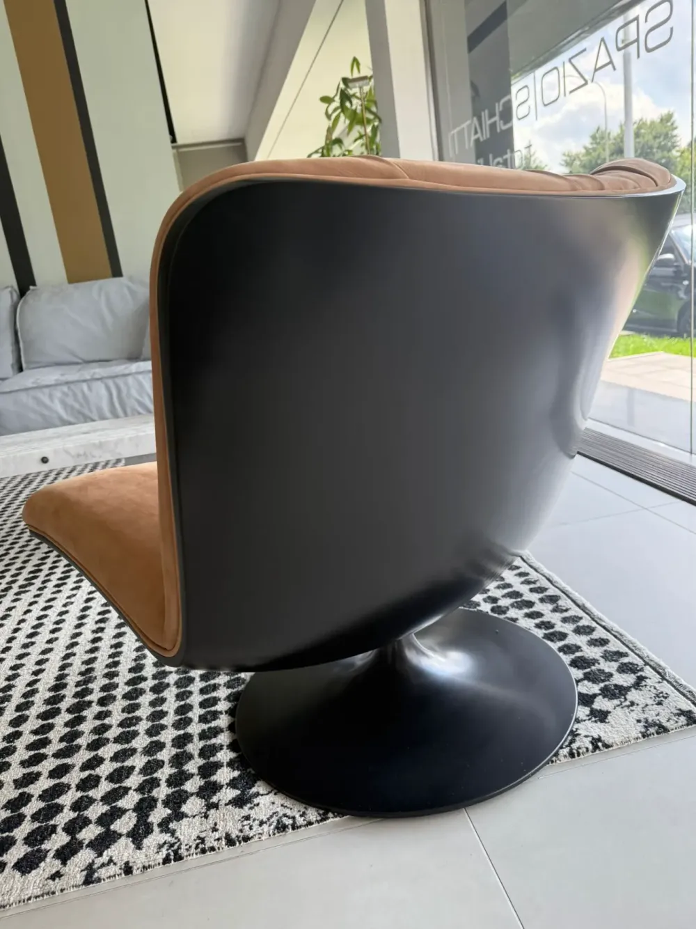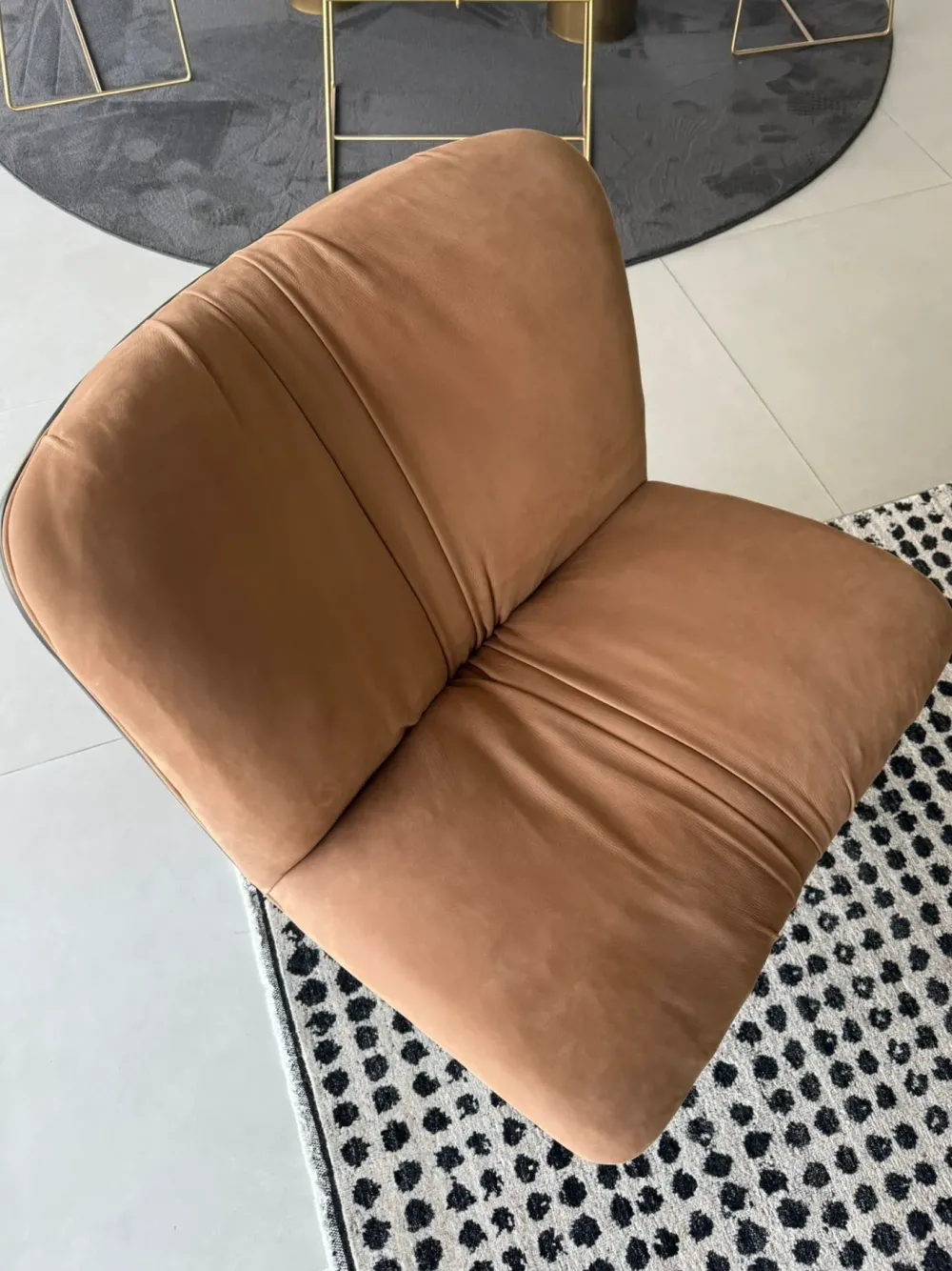 Il rivestimento in pelle nabuk, nella tonalità camel, aggiunge un tocco di eleganza e profondità alla poltrona, rendendola un elemento distintivo in qualsiasi ambiente. La base girevole in metallo nero non solo conferisce stabilità, ma permette anche di godere di una libertà di movimento totale, trasformando ogni seduta in un’esperienza dinamica.