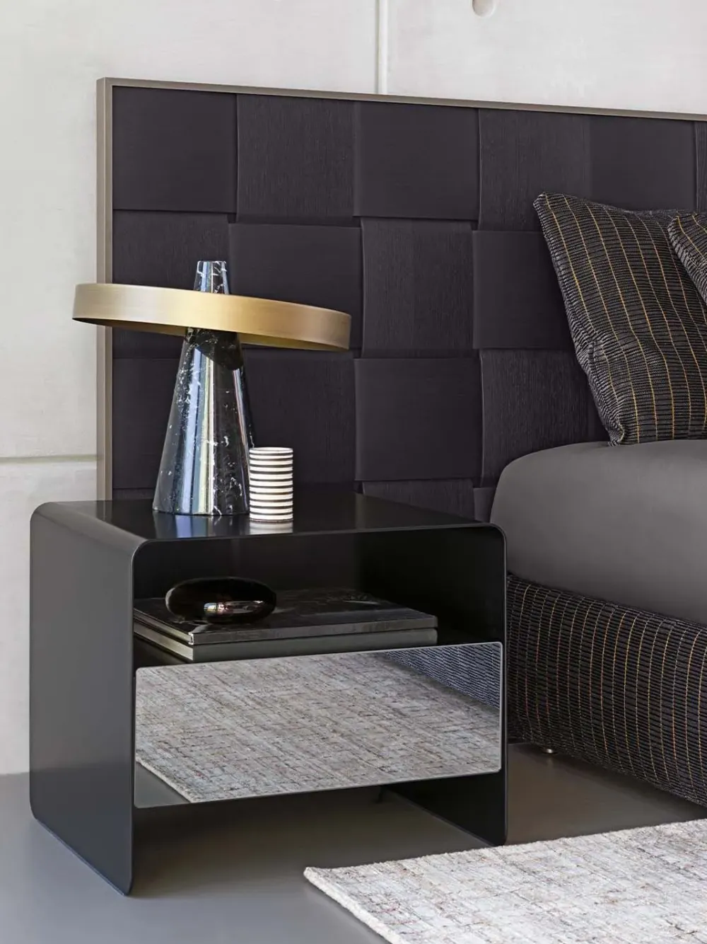 Il cassetto può avere il frontale nella stessa finitura della struttura o in materiali diversi: in grès porcellanato nei colori Concrete e Liquorice oppure a specchio Fumé o Bronzato.