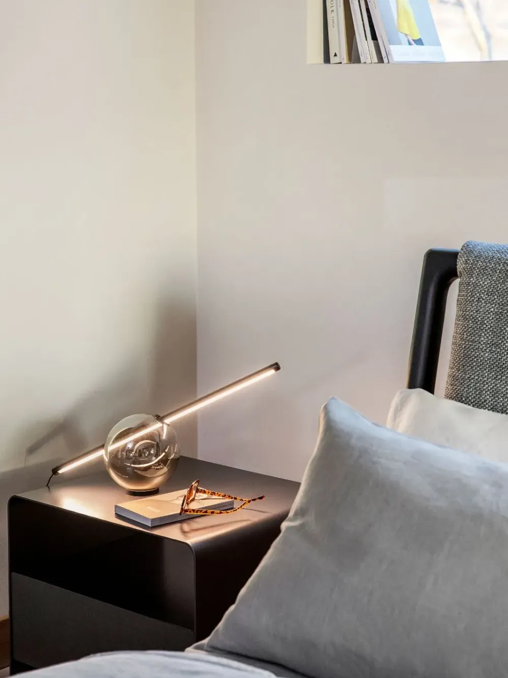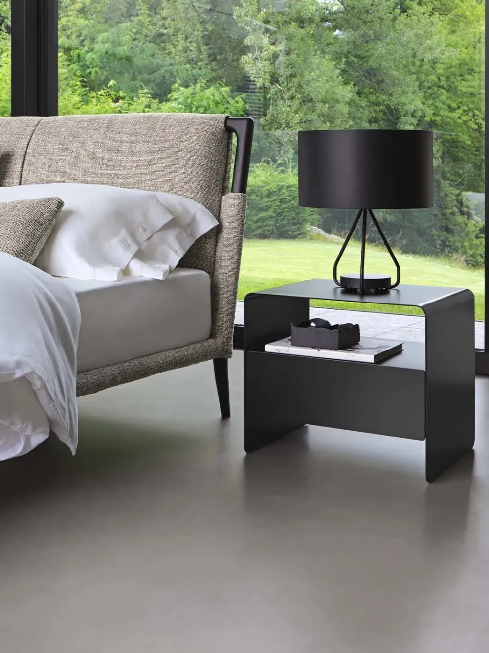 Foglio è un comodino in metallo dalle linee leggere ed essenziali. Composto da una semplice lastra di metallo – con finitura Anodic Bronze, Brunito, Bianco, Greige, Nero, Oxide – curvata in modo armonico, all’interno della quale trova il suo spazio, quasi in sospensione, un contenitore con cassetto e piano di appoggio.
