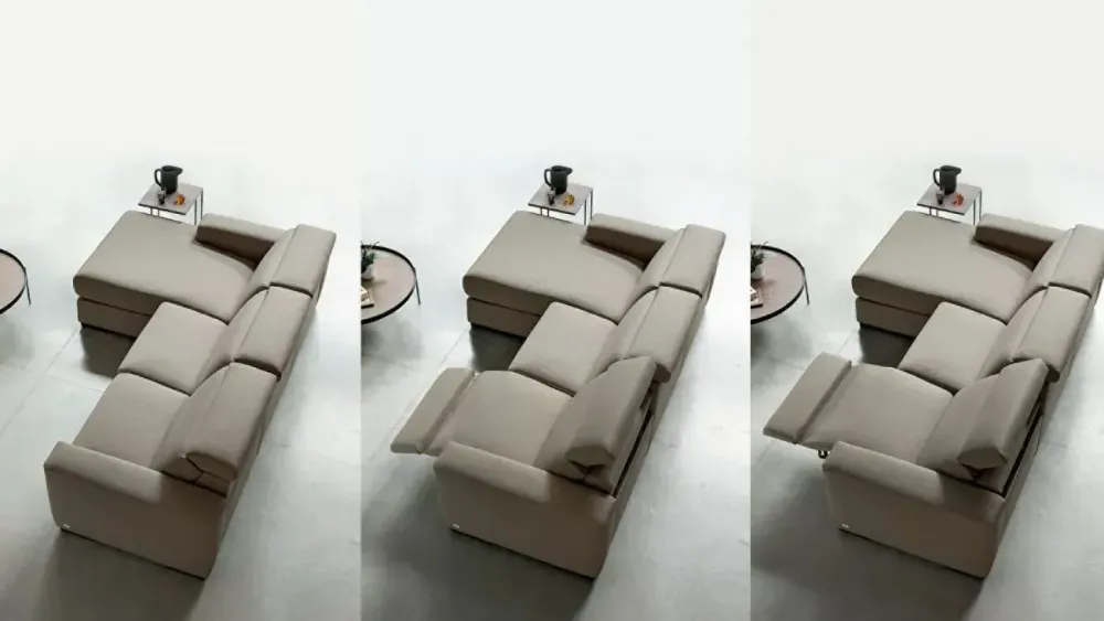 - MECCANISMO RELAX: movimento combinato di schienale reclinabile e sollevamento del poggiapiedi con meccanismo elettronico. Comandi posizionati nel fianco del cuscino di seduta lato bracciolo.