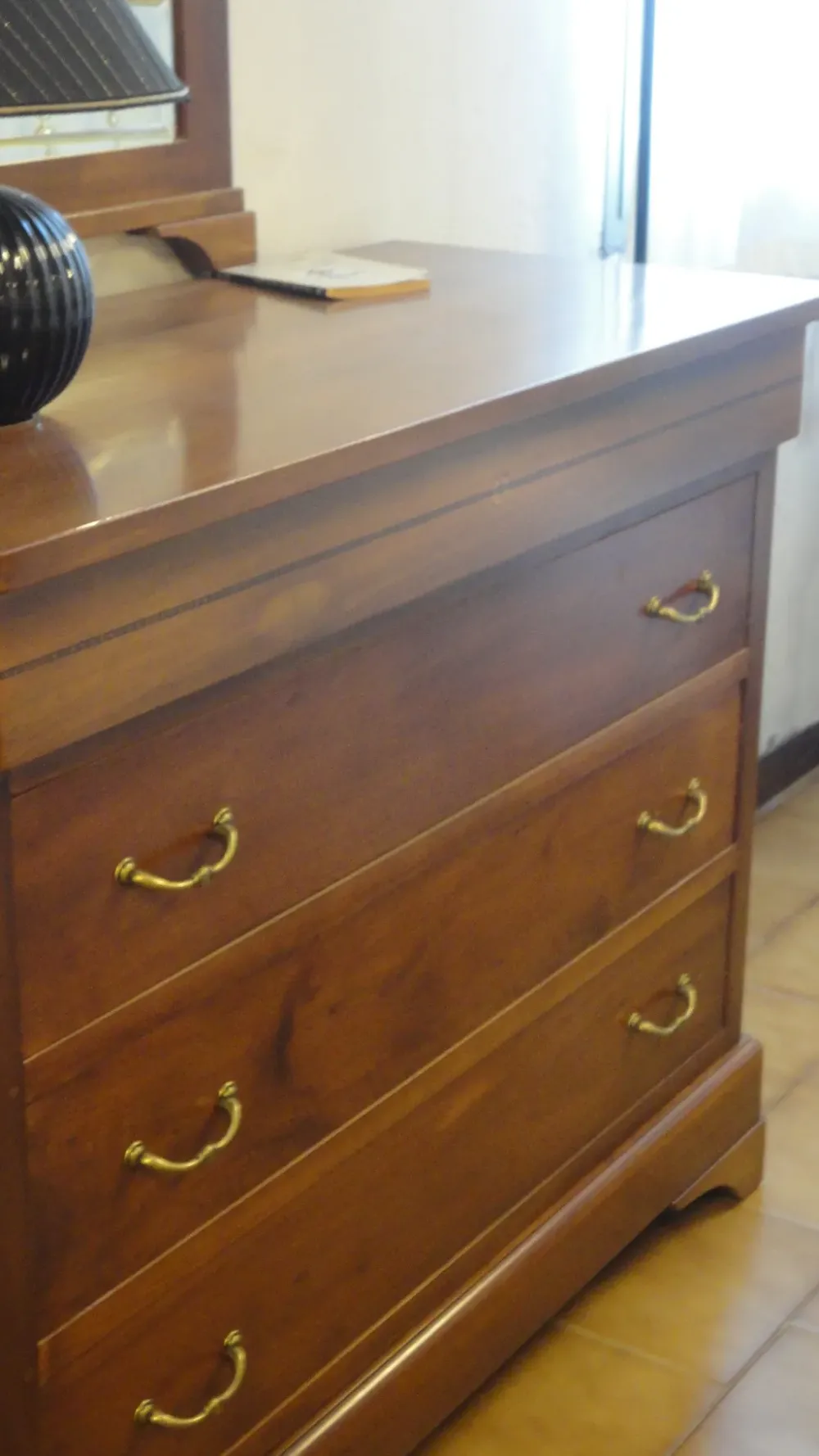 Il gruppo letto è in noce massello , completo di 2 comodini , uno specchio e comò.