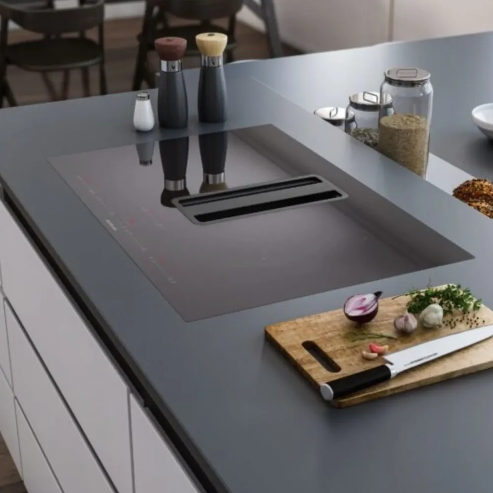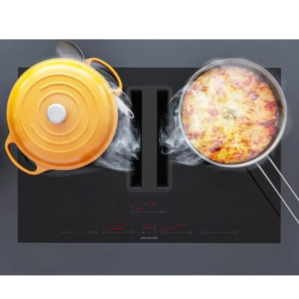 Questo piano cottura offre prestazioni elevatissime grazie alla sua forma aereodinamica, garantendo allo stesso tempo risparmio di spazio in quanto comprende in una sola superficie la cappa e il piano cottura. I prodotti integrati garantiscono un migliore utilizzo dello spazio, grazie alla soluzione 2 in 1. La cappa integrata aspira il vapore e gli odori di cottura direttamente dalla fonte, assicurando così un flusso continuo di aria pulita.