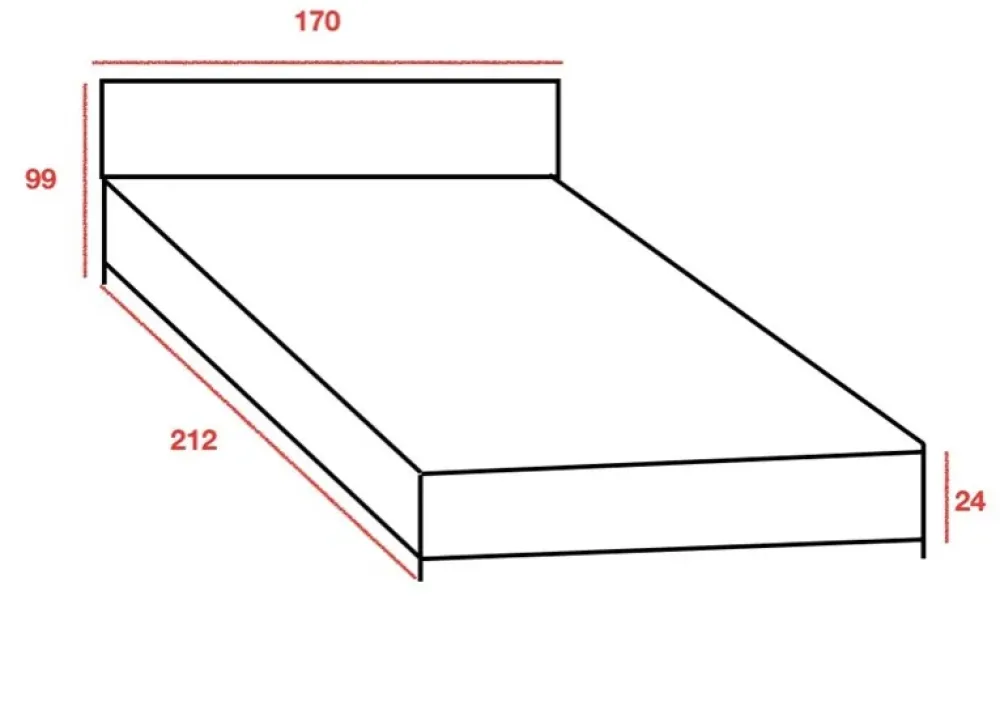 Il letto misura 170 x 212 cm con altezza di 99 cm e giroletto di 24 cm con rete standard in doghe in mutistrato di faggio curvate e flessibili di cm 160 x 195