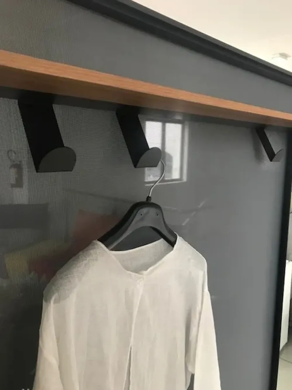 La parte opposta alla madia è composta da mensola superiore in noce canaletto, specchio verticale e appendi abiti spostabili.