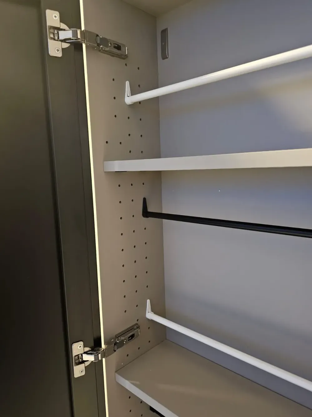Scarpiera Welcome Birex, dotata di 1 anta Sx con specchio naturale, struttura nobilitato avana, completa di ganci appendiabiti e piedini frontali in finitura Titanio.