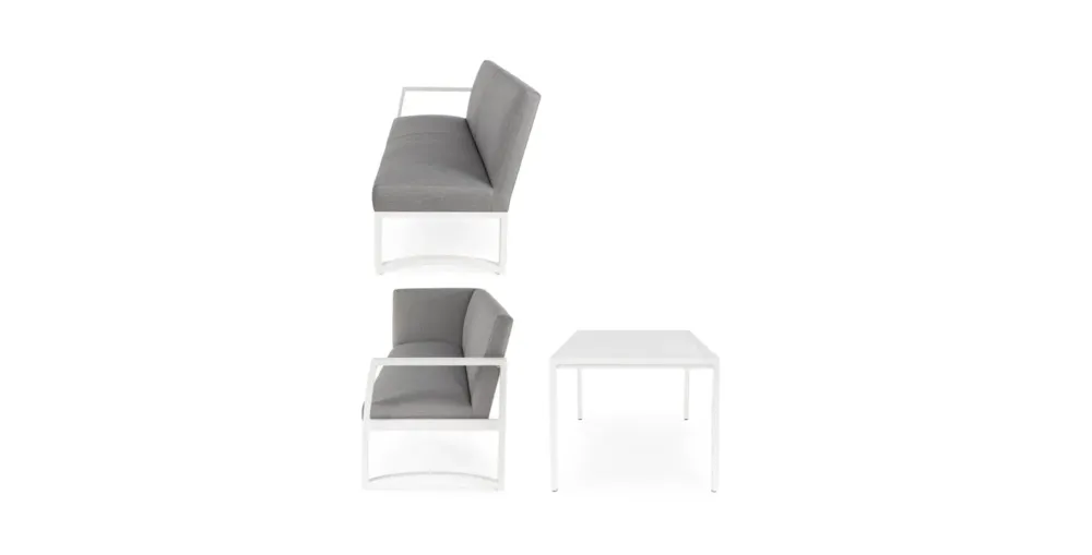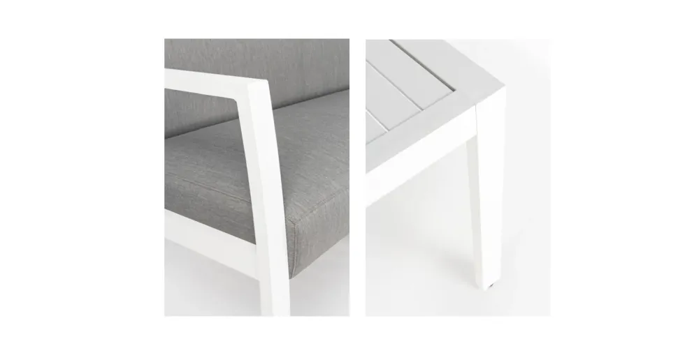 STRUTTURA IN ALLUMINIO, VERNICIATO A POLVERE (POLIESTERE) COLORE BIANCO. SEDUTA E SCHIENALE, NON SFODERABILE, CON TESSUTO PER ESTERNO IN POLIESTERE (250g/m2) IMPERMEABILIZZATO INTERNAMENTE CON RIVESTIMENTO A BASE DI POLIURETANO. COMPLETO DI CUSCINI CON IMBOTTITURA IN SCHIUMA POLIURETANICA SEDUTA (30 kg/m3), SCHIENALE (25kg/m3).