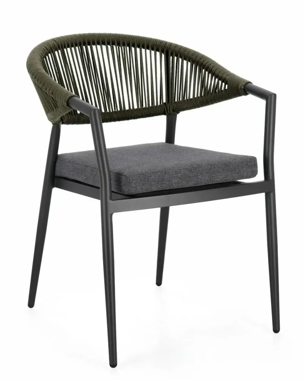 STRUTTURA IN ALLUMINIO VERNICIATA A POLVERE (POLIESTERE). INTRECCIO PER ESTERNO IN CORDA POLIESTERE. CUSCINI SFODERABILI IN TESSUTO IDROREPELLENTE 100% POLIESTERE. IMPILABILE. Misure: Larghezza 57 cm, Profondità 61 cm, Altezza 78 cm.