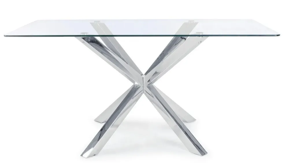 Tavolo in vetro rettangolare con basamento centrale. GAMBE IN ACCIAIO LUCIDO. PIANO IN VETRO TEMPERATO SPESSORE 10MM. GAMBE DA ASSEMBLARE.