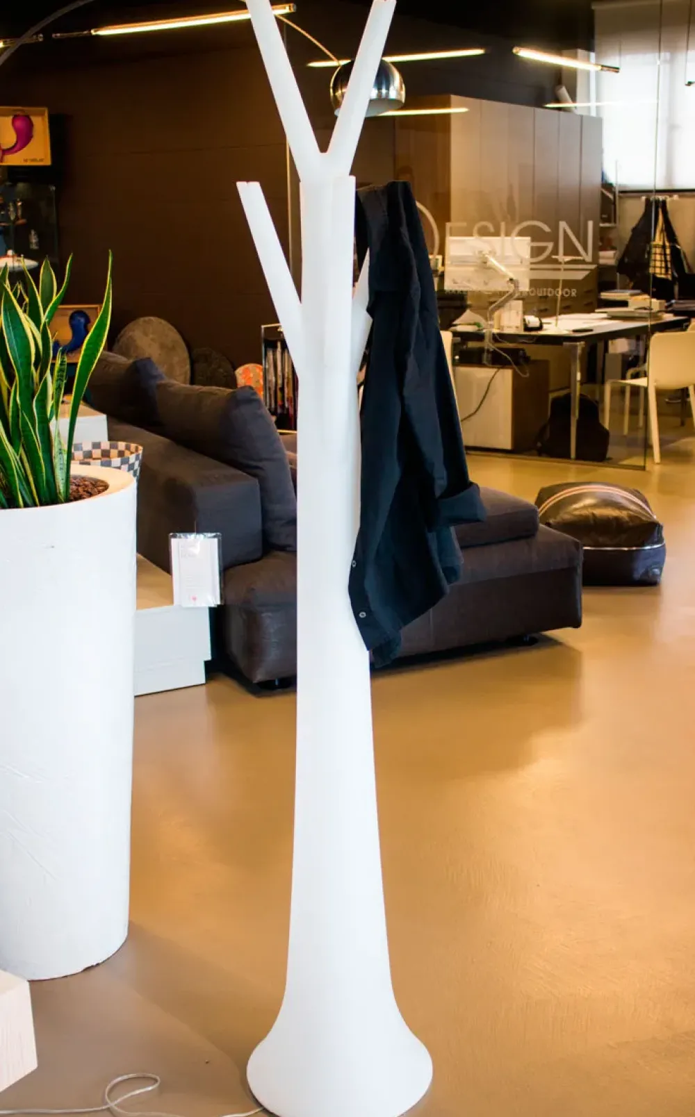 Lampada Tree Light marca Bonaldo dal design moderno e con funzione anche da appendiabito. Illuminazione interna e struttura in polietilene bianco opaco. Misure H 175 cm e P 31 cm