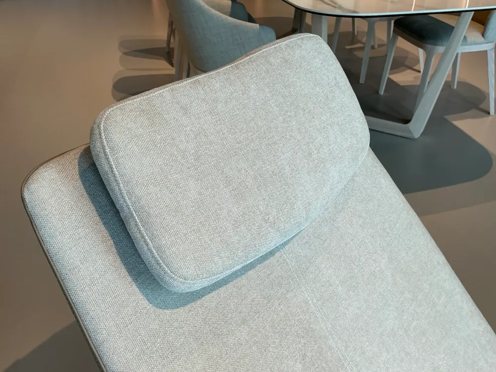 Chaise-longue di design di BINALDO rivestimento in tessuto e basamento finitura piombo.