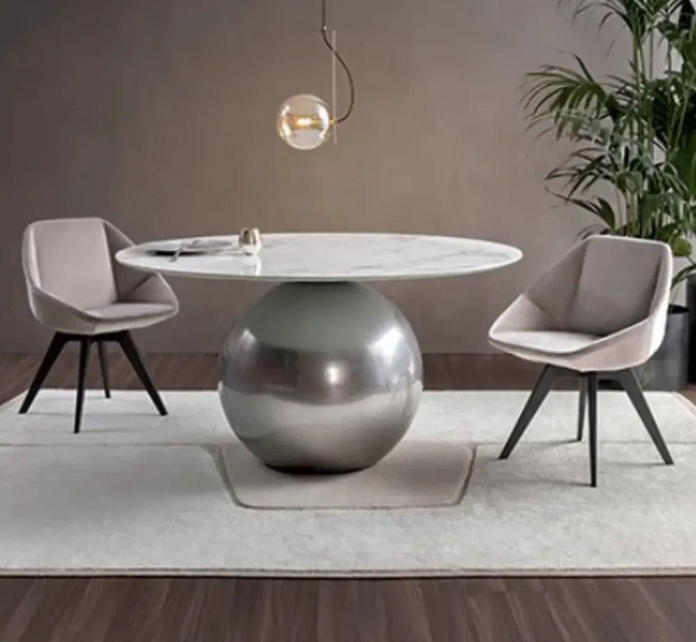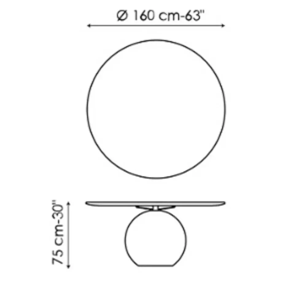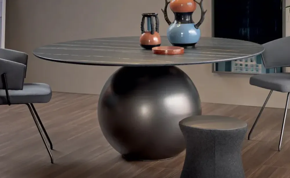 Circus è un tavolo rotondo di design che richiama le leggi della fisica per la contrapposizione di forme geometriche differenti: la base centrale sferica, imponente e scenografica, è sormontata da un grande piano a disco, evocando una piacevole sensazione di movimento. Il tavolo rotondo di design acquista forza ed eleganza in un gioco di equilibri unico nel suo genere, diventando il vero protagonista della zona living. Il piano è disponibile in legno massello, ceramica o marmo, e si adatta perfettamente allo stile dell’abitazione, fondendosi armoniosamente con l’ambiente senza però perdere la propria unicità. La base in metallo è disponibile in differenti finiture, tra cui le eleganti bronzo, piombo, dark nickel, brown nickel, oro perlato e clouded chrome.