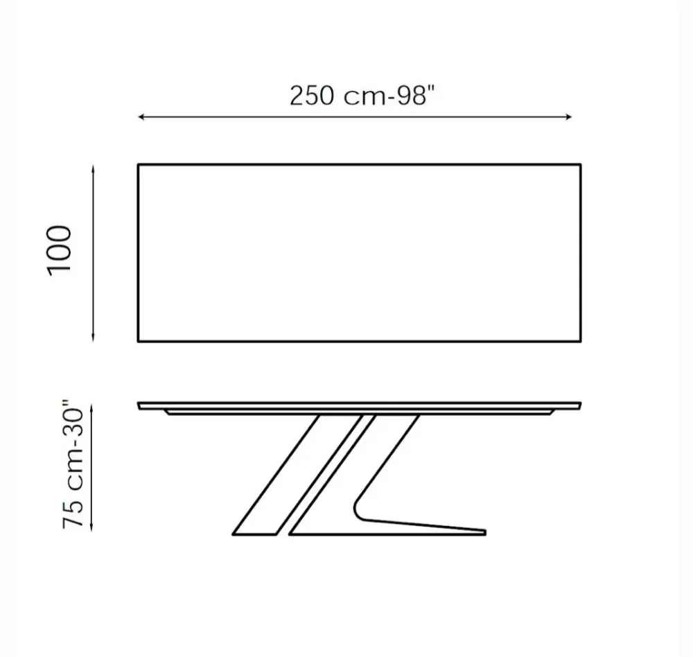 Gli elementi che compongono la base inclinata del tavolo sono realizzati entrambi in metallo verniciato. La versione più piccola da 200 cm, invece, è dotata di un solo elemento centrale a forma di L che regge il piano. La struttura è disponibile nelle seguenti finiture: Bianco, Nero, Grigio Antracite, Tortora oppure in alternativa in Rame, Ottone o Decapato.