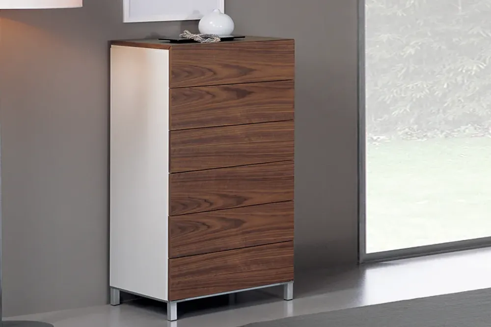 Ideale per camere da letto, soggiorni o disimpegni. Pratica e funzionale, esteticamente apprezzabile per il raffinato contrasto tra la venatura dei frontali cassetto e del top in essenza noce ed i fianchi laccato bianco.