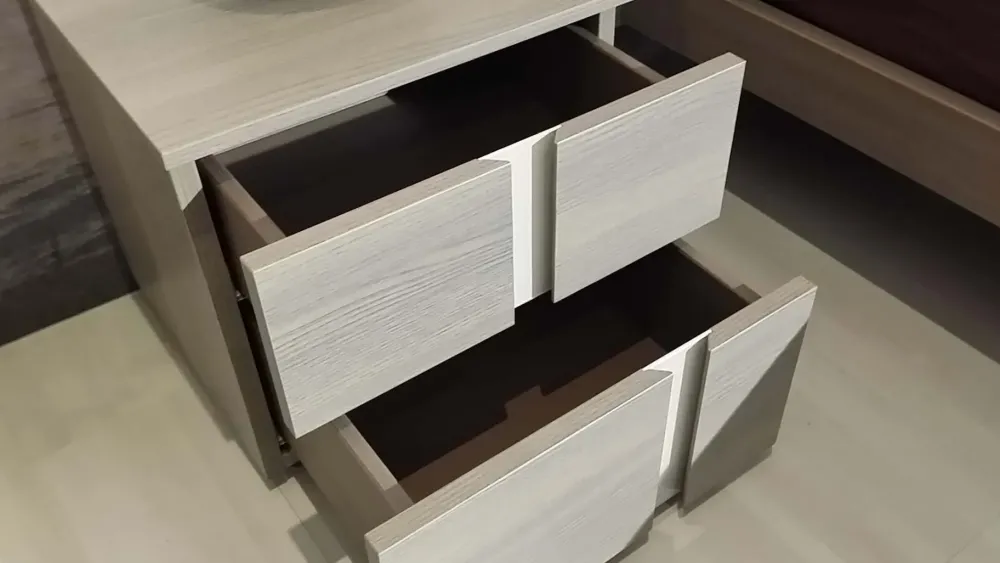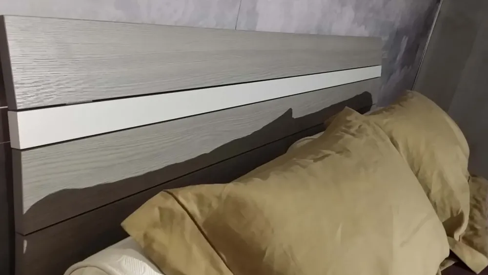 Il gruppo letto è in finitura frassino cenere materico con inserti in finitura grigio madreperla.