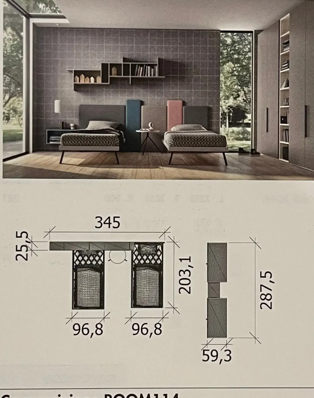 Camera Mottes Mobili un grande armadio da condividere, con il vano centrale in Rovere Chiaro che separa il guardaroba dei fratelli. La maniglia Antracite dà carattere all’estetica pulita dell’anta. Ogni elemento si può personalizzare con tutte le finiture. La testiera “Puzzle” ancorata a parete è la protagonista della camera, con i suoi soffici pannelli imbottiti che giocano su diverse dimensioni e si possono personalizzare con i tessuti Libera la tua fantasia e crea degli abbinamenti unici e divertenti. I tempi di consegna sono di circa 50//60 giorni lavorativi Il prezzo è di 3300 euro iva e consegna compresa. Si possono modificare i colori senza variazione di prezzo! Per qualsiasi informazione contattateci in privato!
